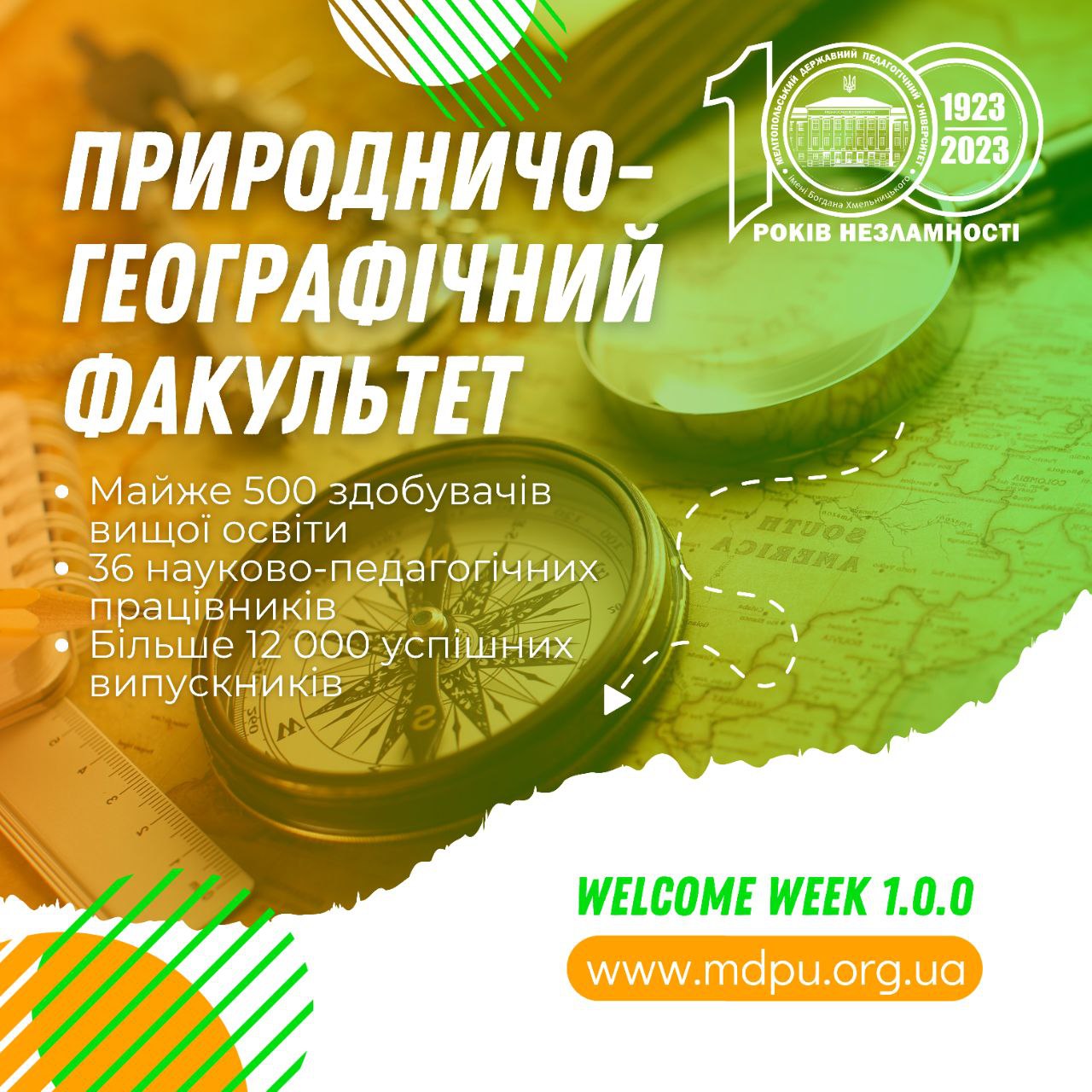 Сучасний, цікавий та привабливий для молоді! ЦЕ ПРИРОДНИЧО-ГЕОГРАФІЧНИЙ ФАКУЛЬТЕТ, історія якого починається ще з 1961 року! Сьогодні команду здобувачів та науково-педагогічний колектив очолює декан, кандидат історичних наук, доцент Полякова Лариса Іванівна! На 4 кафедрах факультету здійснюється підготовка майбутніх фахівців за спеціальностями: 🔵Середня освіта (Географія); 🔵Середня освіта (Фізична культура); 🔵Середня освіта (Історія); 🔵Фізична культура і спорт; 🔵Туризм […]
