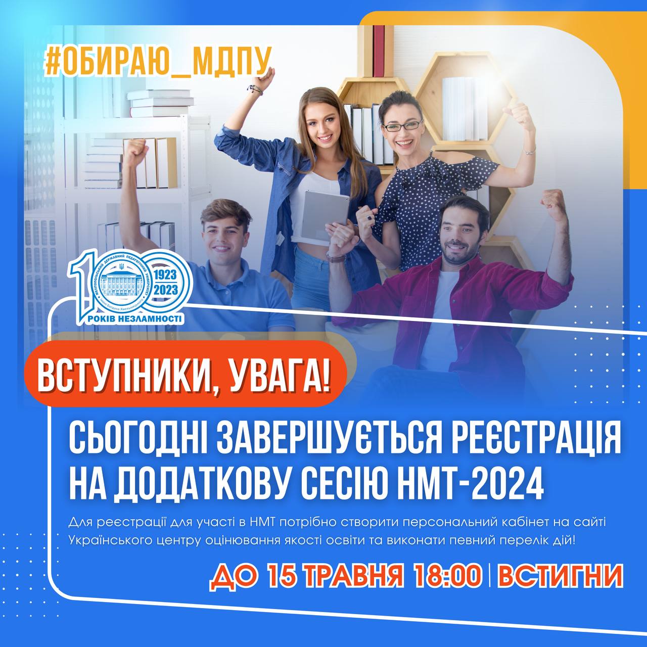 ОСТАННІЙ ДЕНЬ РЕЄСТРАЦІЇ НА ДОДАТКОВУ СЕСІЮ НМТ-2024 До уваги вступників! Сьогодні 15 травня до 18:00 встигніть ЗАРЕЄСТРУВАТИСЯ НА ДОДАТКОВУ СЕСІЮ НМТ! Зареєструватися для участі в додатковій сесії НМТ можуть особи, які: за рішенням судів перебувають в установах виконання покарань, слідчих ізоляторах; не змогли з поважних причин зареєструватися для проходження НМТ під час основного періоду реєстрації; […]