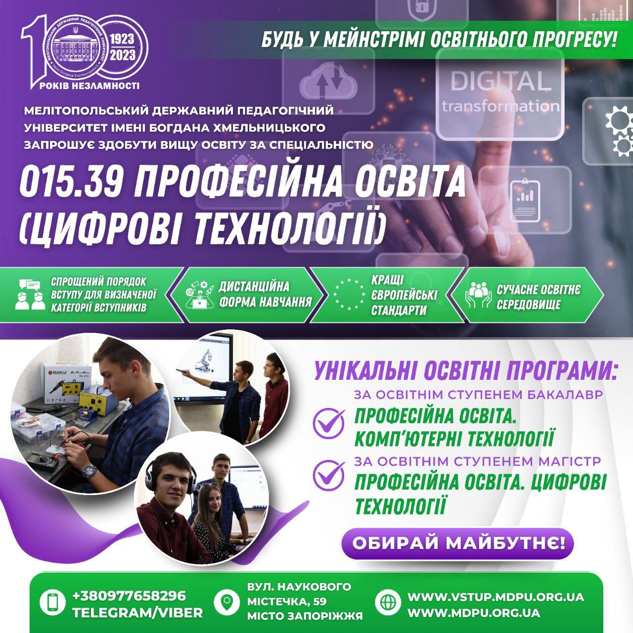 ОБИРАЙ ПРОФЕСІЮ МАЙБУТНЬОГО В МДПУ! Факультет інформатики, математики та економіки МДПУ імені Богдана Хмельницького запрошує здобути вищу освіту за УНІКАЛЬНИМИ ОСВІТНІМИ ПРОГРАМАМИ! Обирай спеціальність 015.39 ПРОФЕСІЙНА ОСВІТА (ЦИФРОВІ ТЕХНОЛОГІЇ): За освітнім ступеней Бакалавр освітня програма:Професійна освіта. Компʼютерні технології За освітнім ступенем Магістр освітня програма:Професійна освіта. Цифрові технології Кращі пропозиції саме для тебе: ВСТУП БЕЗ НМТ для […]