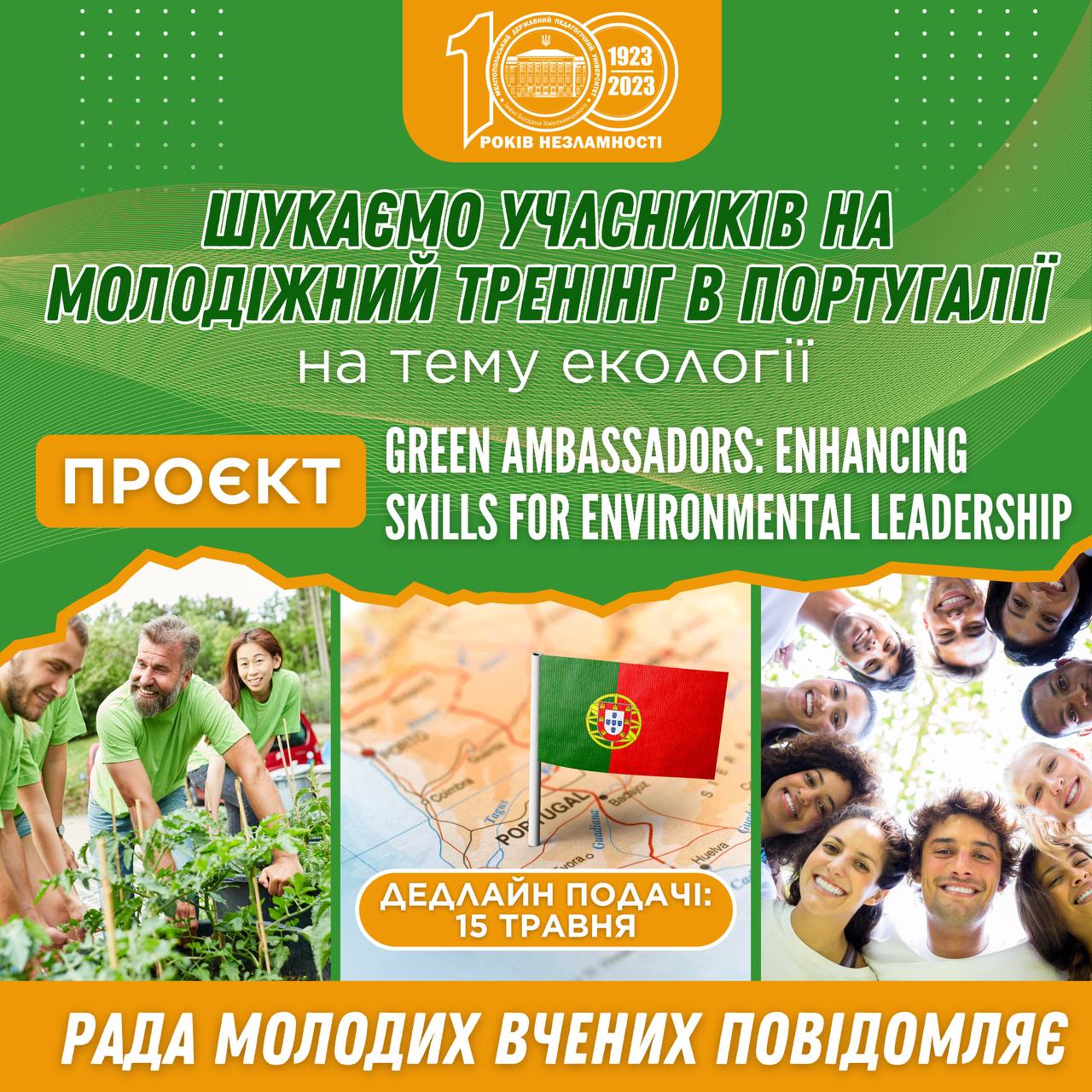 РАДА МОЛОДИХ ВЧЕНИХ ІНФОРМУЄ Шукаємо учасників на Erasmus+ тренінг в Португалії на тему екології! Проєкт: Green Ambassadors: Enhancing skills for environmental leadership Коли: 04-10.07.2024 Де: Vila Nova de Tazem, Portugal (умови проживання – кемпінг) Тобі можна подавати заявку на участь в обміні, якщо ти:віком від 18 роківзацікавлений(а) в проєктах неформальної освіти хочеш приєднатися до крутого […]