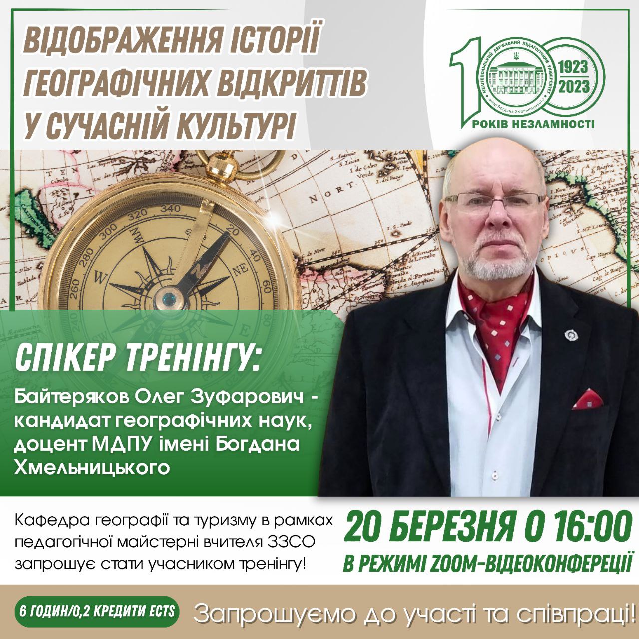 ДО УВАГИ ВЧИТЕЛІВ ГЕОГРАФІЇ Кафедра географії та туризму в рамках педагогічної майстерні вчителя ЗЗСО запрошує стати учасником тренінгу “Відображення історії географічних відкриттів у сучасній культурі”! Спікер: Байтеряков Олег Зуфарович – кандидат географічних наук, доцент Захід відбудеться 20 березня 2024 року у віртуальному залі ZOOM-відеоконференціЇ Усі участники тренінгу отримають безкоштовно сертифікат участі на 6 годин/0,2 кредити […]