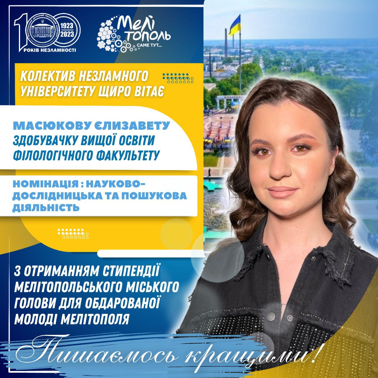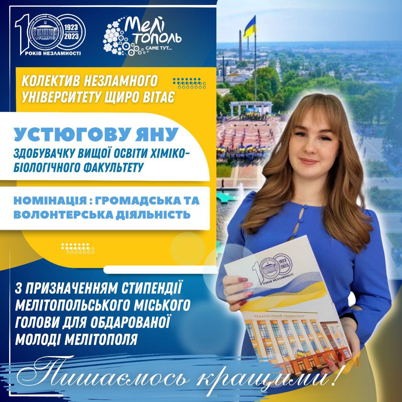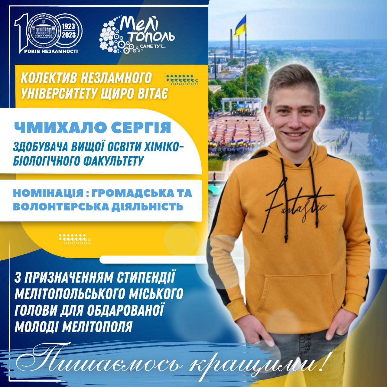 НАЙКРАЩІ ЗДОБУВАЧІ ВИЩОЇ ОСВІТИ – ЛИШЕ В МДПУ ІМЕНІ БОГДАНА ХМЕЛЬНИЦЬКОГО! Родина незламного Мелітопольського державного педагогічного університету імені Богдана Хмельницького вітає здобувача вищої освіти ІV року навчання спеціальності 101 Екологія, хіміко-біологічного факультету ЧМИХАЛО СЕРГІЯ РОМАНОВИЧА з призначенням стипендії Мелітопольського міського голови для обдарованої молоді міста! За час навчання зарекомендував себе сумлінним і дисциплінованим студентом. Середній […]