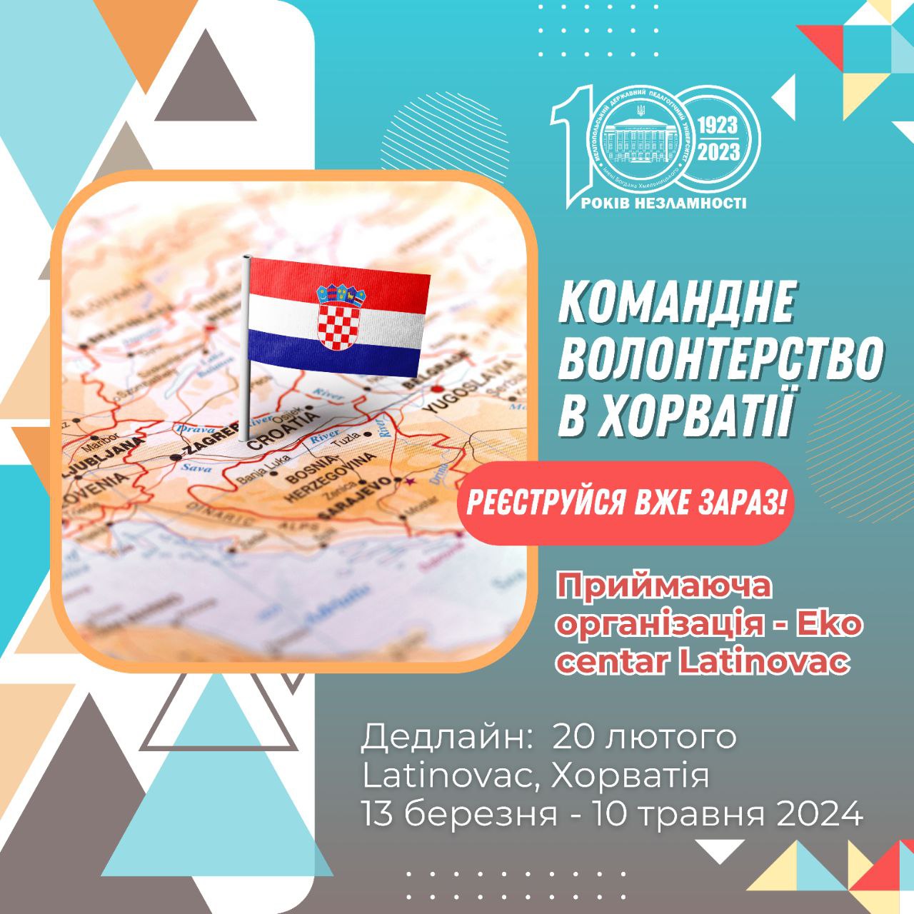 НАУКОВИЙ ВІДДІЛ ІНФОРМУЄ Командне волонтерство в Хорватії! Приймаюча організація – Eko centar Latinovac. Головна мета організації – сприяти розвитку спільноти Латиноваця, поширювати знання про сталий розвиток та екологію, формувати активну громадську позицію, розвивати сільський туризм Дедлайн: 20 лютого Latinovac, Хорватія 13 березня – 10 травня 2024 Вимоги: 18-30 років базове знання англійської мови зацікавленість […]