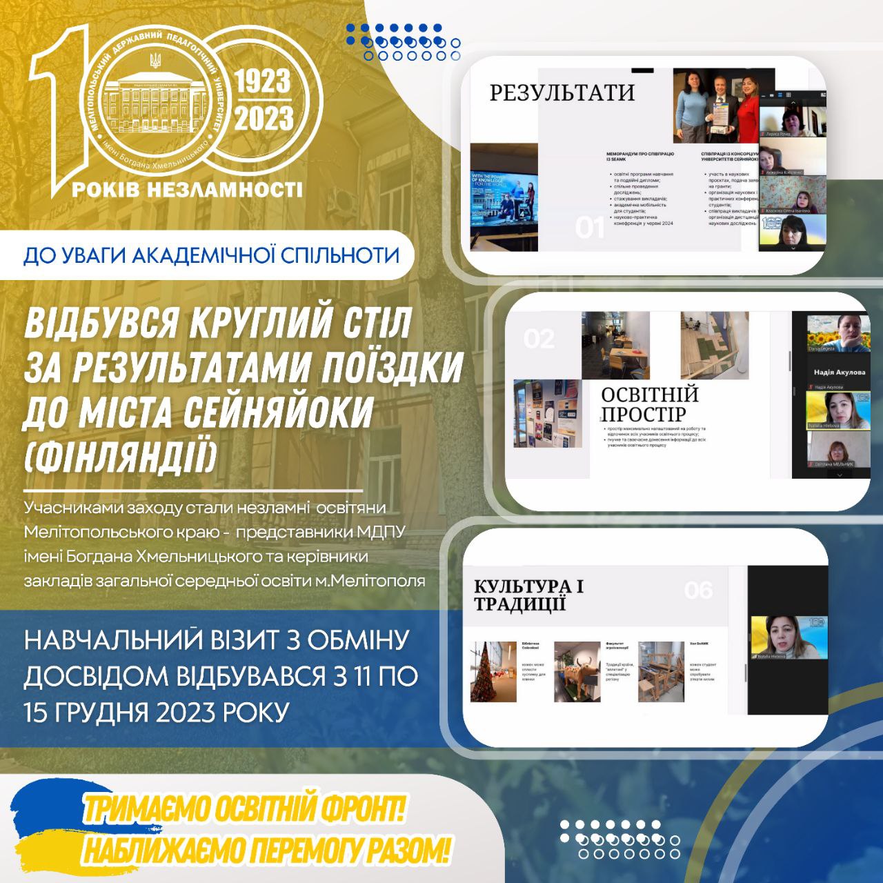 ДО УВАГИ АКАДЕМІЧНОЇ СПІЛЬНОТИ УНІВЕРСИТЕТУ Сьогодні, 26 грудня, відбувся круглий стіл за результатами поїздки до м. Сейняйоки (Фінляндії). Навчальний візит з обміну досвідом відбувався з 11.12.2023-15.12.2023 р.р. Перший проректор університету Наталя Глебова ознайомила освітян міста Мелітополя зі сталими моделями та кращими практиками фінської системи освіти. Учасники подорожі визначили напрямки співпраці між закладами загальної середньої, професійної […]