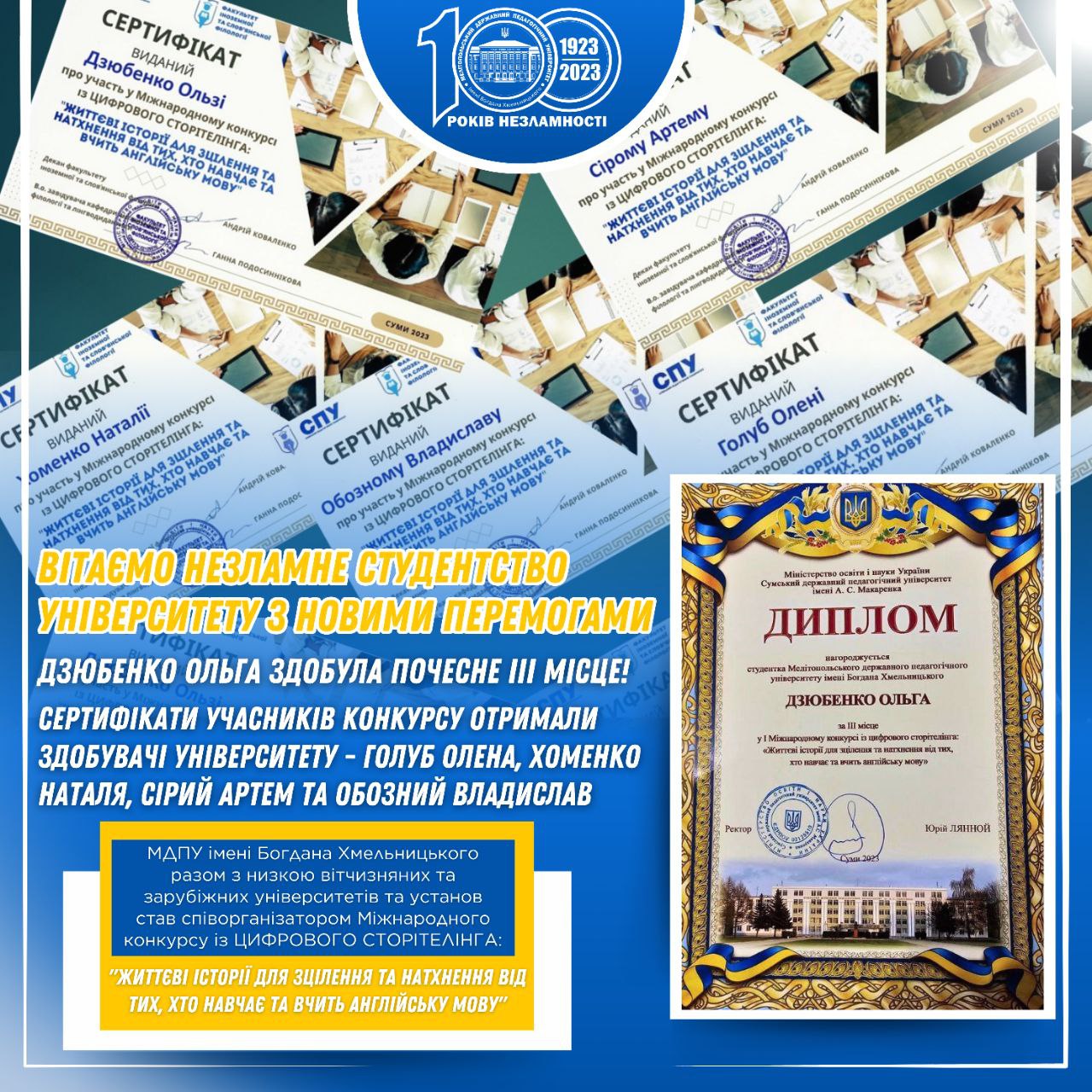 З 11 по 14 грудня 2023р. проходила серія онлайн воркшопів «Практика цифрового навчання, орієнтованого на студента» з провідними тренерами проєкту Програми Erasmus+ Bringing Opportunities and Organizational Success To Small Local Universities in Ukraine (BOOST). На завершальній зустрічі викладачі МДПУ імені Богдана Хмельницького Ганна Варіна та Альона Чорна – учасники курсу Digital learning tools and platforms […]