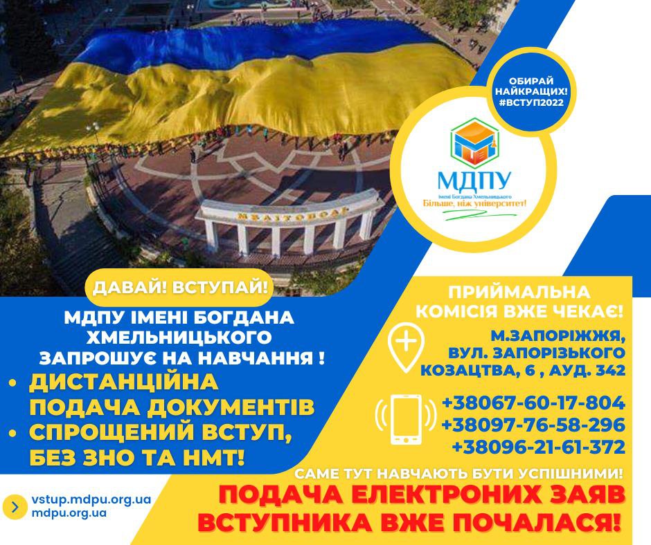Щоб отримати ДИПЛОМ ЄВРОПЕЙСЬКОГО ЗРАЗКА та ВИЩУ ОСВІТУ ДЕРЖАВНОГО СТАНДАРТУ, обирай Мелітопольський державний педагогічний університет імені Богдана Хмельницького, який офіційно перереєстрований у місті Запоріжжі та здійснює свою освітню та наукову діяльність у правовому полі держави УКРАЇНА.