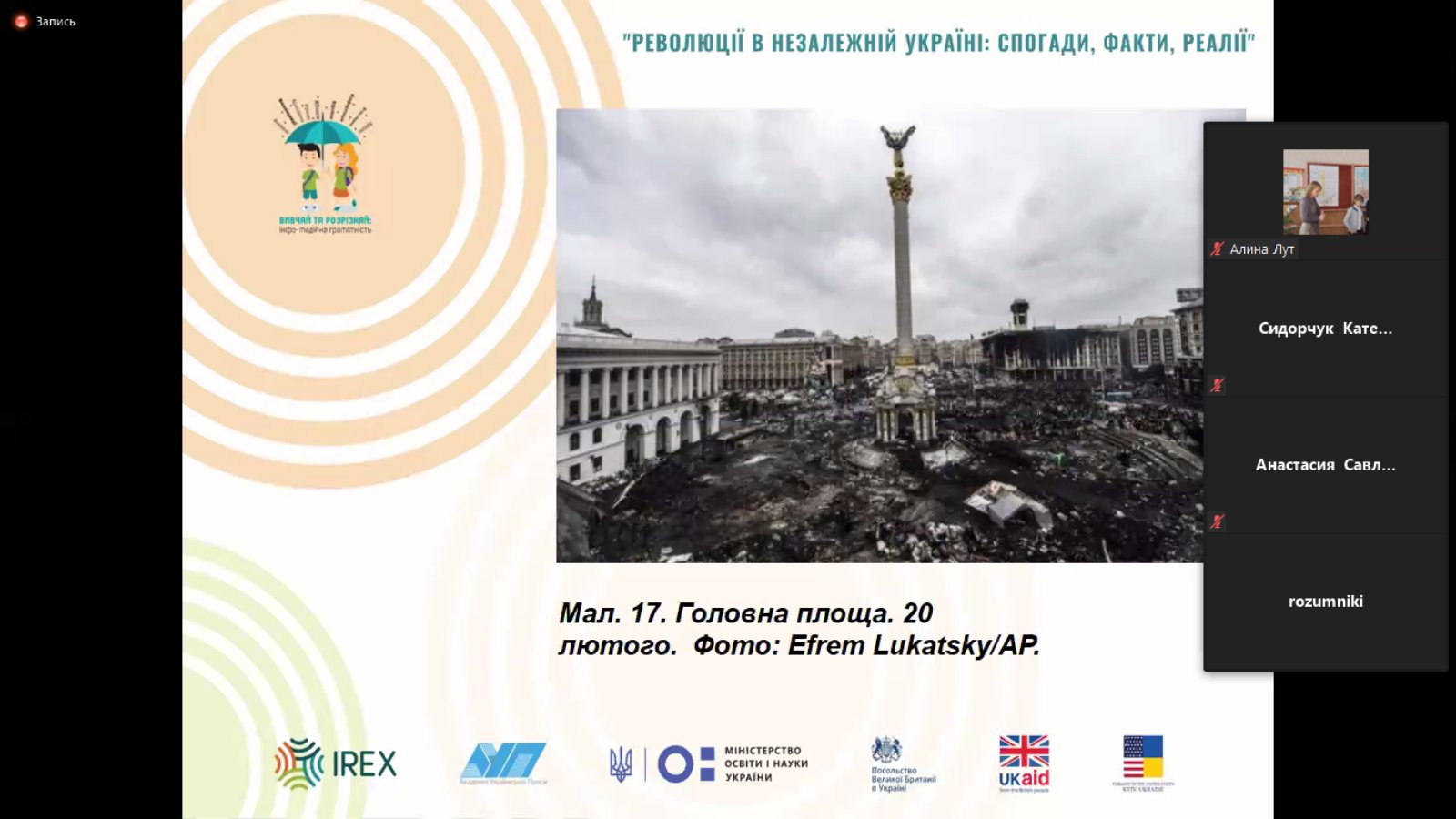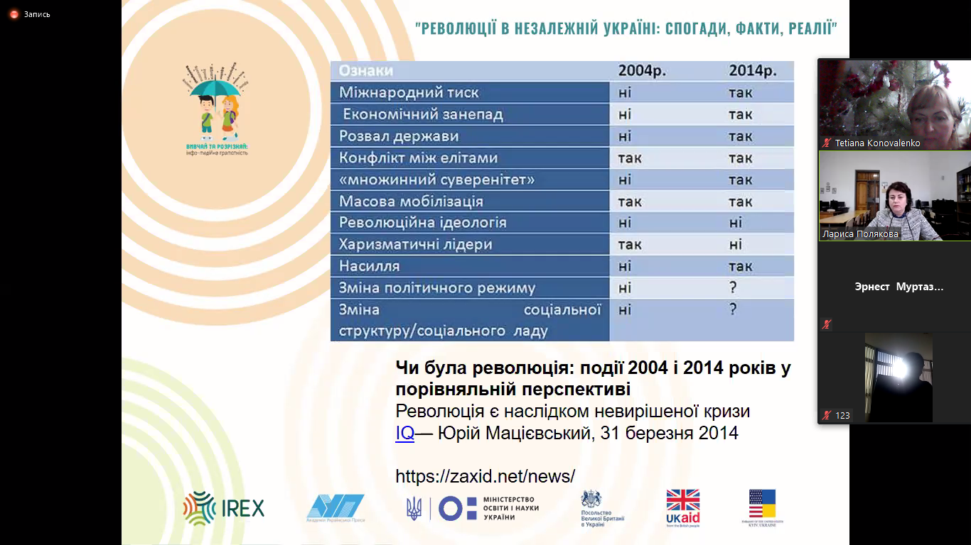 29 грудня в межах реалізації проекту Міжнародної ради наукових досліджень IREX «Вивчай та розрізняй: інфо-медійна грамотність» доцент кафедри історії та археології Полякова Л.І. провела інтерактивну лекцію «Революції в незалежній Україні: спогади, факти, реалії». На лекції були присутні вчителі, студенти, зацікавлені особи.