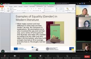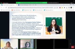 12 грудня 2023 р члени команди проєкту “Strengthening the EU common values through the policy of multilingualism in the education and training of future teachers” 101083321 – SEUCV ETT – ERASMUS-JMO-2022-HEI-TCH-RSCH Програми Європейського Союзу Еразмус+ напряму Жан Моне доценти Калужська Л.О., Маслова А.В., Гончарова О.А. та студенти 4 курсу філологічного факультету провели міні- конференцію «EU common values promotion and dissemination through foreign language teaching», яка підбила підсумки практичної частини проєкту. Міні-конфереція дозволила студентам продемонструвати свої надбання. На заході здобувачі представили Портфоліо Mайбутнього Вчителя Іноземної Мови з інформацією про себе, свій підхід до імплементації цінностей Європейського Союзу в освіту країни та власні розробки фрагментів уроку з навчання ключових цінностей ЄС.