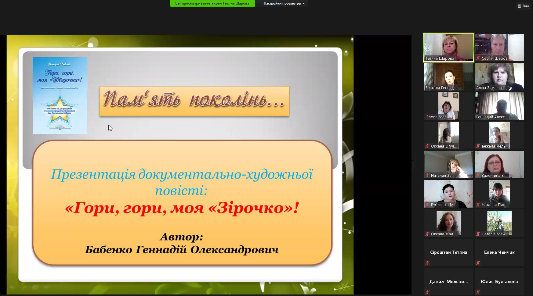 26 жовтня 2020 р. доцентом кафедри української і зарубіжної літератури Т.М. Шаровою було організовано і проведено презентацію документально-художньої повісті Геннадія Олександровича Бабенка «Гори, гори, моя «Звёздочка»!, присвяченої 90-річчю з дня народження його матері, видатного педагога м. Мелітополя, завідувачки яслі-саду №99 «Зірочка» у період з 1970 по 2001 роки Ади Григорівни Бабенко.