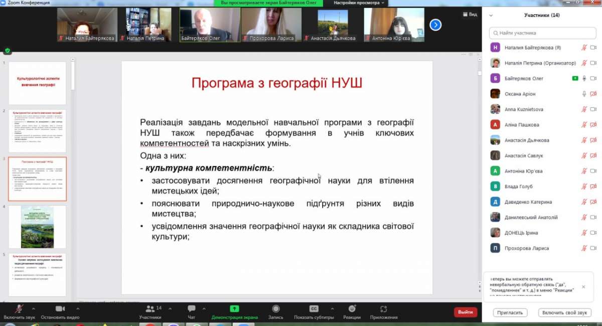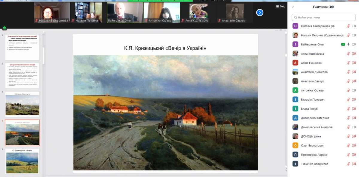 У другій частині лекції Олег Зуфарович поділився досвідом і власною методикою застосування творів живопису в географічній освіті для формування ключових компетентностей у здобувачів освіти. В ході лекції було проведено тренінг з комплексного географічного аналізу творів живопису на прикладі картин українських художників М. Сергіїва «Яблуні в цвіту», К. Крижицького «Вечір в Україні», А. Куїнджі «Нива» та ін. На прикладі застосування картин українських художників учасники також ознайомились із методичними аспектами формування навичок орієнтування на місцевості. Третю частину лекції було присвячено методичним особливостям використання творів художньої літератури для виконання картографічних завдань. Зокрема, за сюжетною лінією роману Ж. Верна «Діти капітана Гранта», аудиторія мала можливість роздивитись систему течій світового океану.