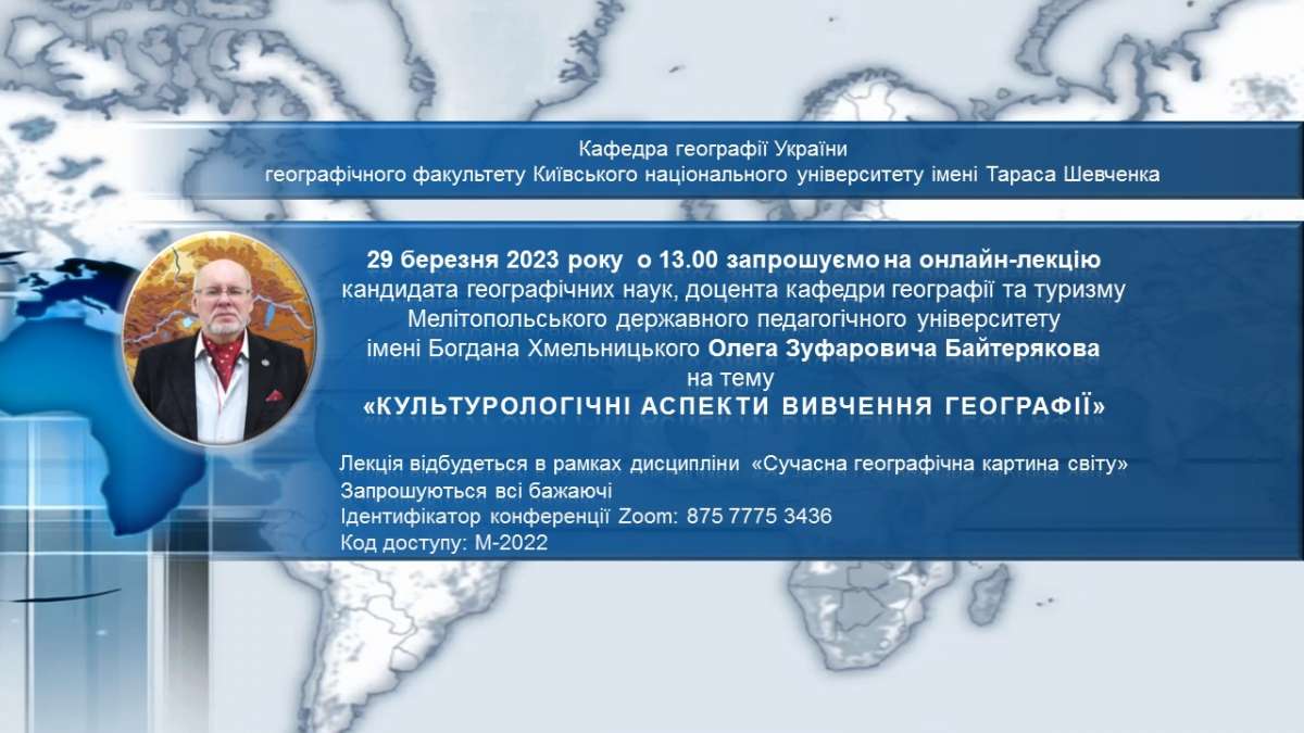 Під час лекції О. Байтеряков зупинився на значенні культурологічної складової у вивченні географії, що з одного боку пов’язане з погіршенням обізнаності сучасної молоді у сфері культури, з іншого – застосування творів художньої літератури і живопису під час вивчення географічних дисциплін дозволяє краще усвідомити наукову картину світу, розширити уявлення про джерела географічної інформації та з’ясувати географічний зміст витворів культури. Значну увагу лектор приділив огляду географічного змісту творів українських художників і письменників.