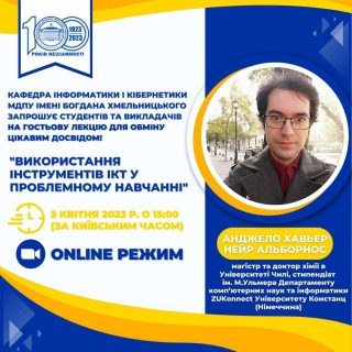 Кафедра інформатики і кібернетики 05 квітня о 15:00 запрошує стати учасником гостьової лекції Анджело Хавьера Нейра Альборноса, магістра та доктора хімії в Університеті Чилі, стипендіата ім. М.Ульмера Департаменту комп’ютерних наук та інформатики ZUKonnect Університету Констанц (Німеччина)!