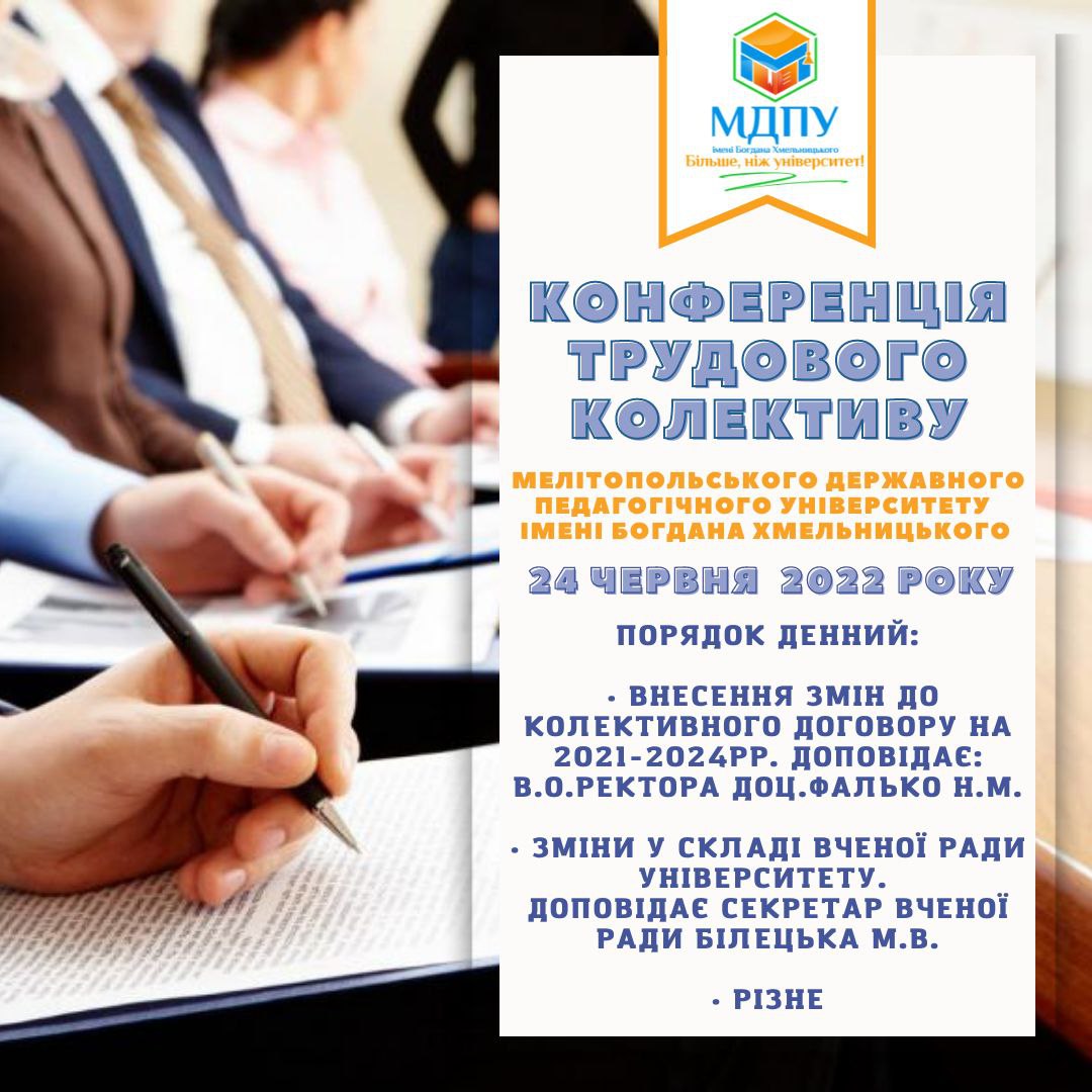 24 червня 2022 року о 14.00 відбудеться Конференція трудового колективу Мелітопольського державного педагогічного університету імені Богдана Хмельницького.