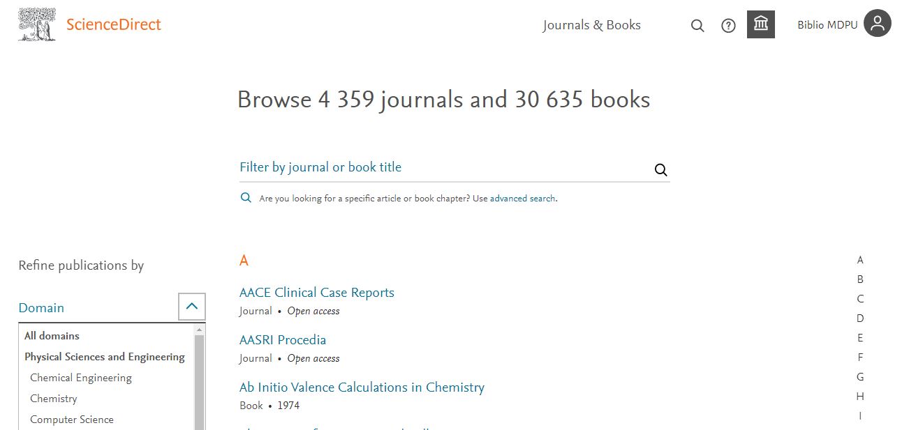 Мультидисциплінарна платформа ScienceDirect забезпечує всебічний доступ до літератури з усіх галузей науки, надаючи можливість ознайомитися з більш ніж 13 млн. публікацій з 2500 наукових журналів і більше 33000 книг видавництва Elsevier, а також величезним числом журналів, опублікованих престижними науковими спільнотами.