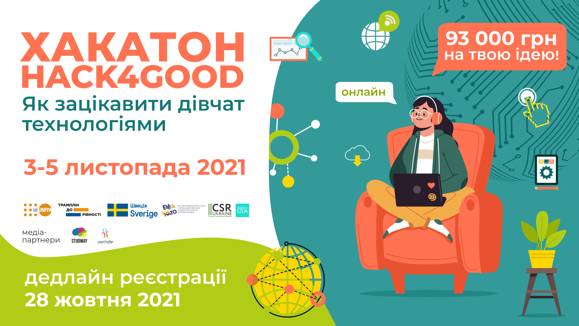 Щоб вирівняти статистику й зацікавити ще більше дівчат STEM, впродовж 3-5 листопада 2021 року відбудеться онлайн-хакатон для студенток “Hack4Good: як зацікавити дівчат технологіями”. Мета хакатону – підвищити рівень знань дівчат про гендерну рівність та навчити їх дизайн-мисленню, щоб розробити командні проєкти, спрямовані на заохочення дівчаток до технічних спеціальностей.