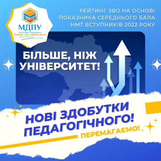 Інформаційною системою «Вступ.ОСВІТА.UA» складений рейтинг закладів вищої освіти на основі показника середнього бала НМТ абітурієнтів, яких у 2022 році зараховано до ЗВО на навчання за кошти державного або місцевого бюджетів! Цьогоріч Мелітопольський державний педагогічний університет імені Богдана Хмельницького ПОКРАЩИВ свої показники у загальному рейтингу НА 20 ПОЗИЦІЙ!