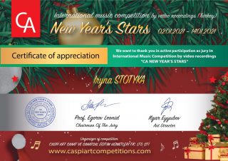 3 02.01.2021р. по 14.01.2021р. в Туреччині проходив Міжнародний конкурс мистецтв «CA NEW YEAR’S STARS» (за відеозаписами), організатор CASPİ ART SANAT VE SANATSAL EĞİTİM HİZMETLERİ TİC. LTD. ŞTİ., м.Мерсін.