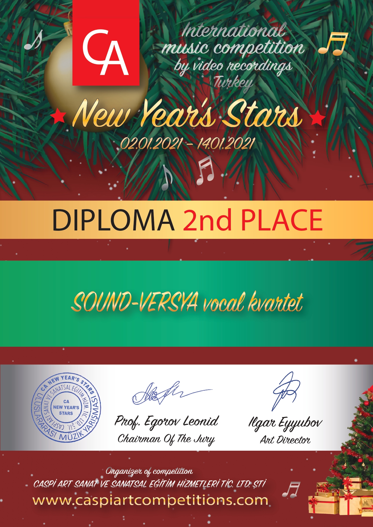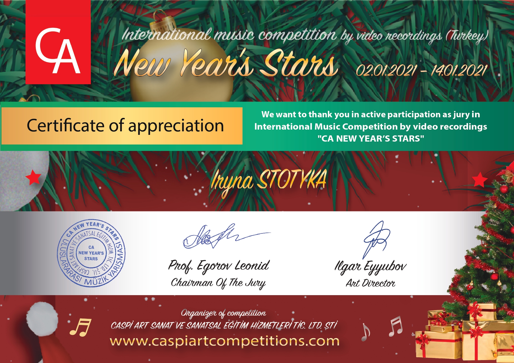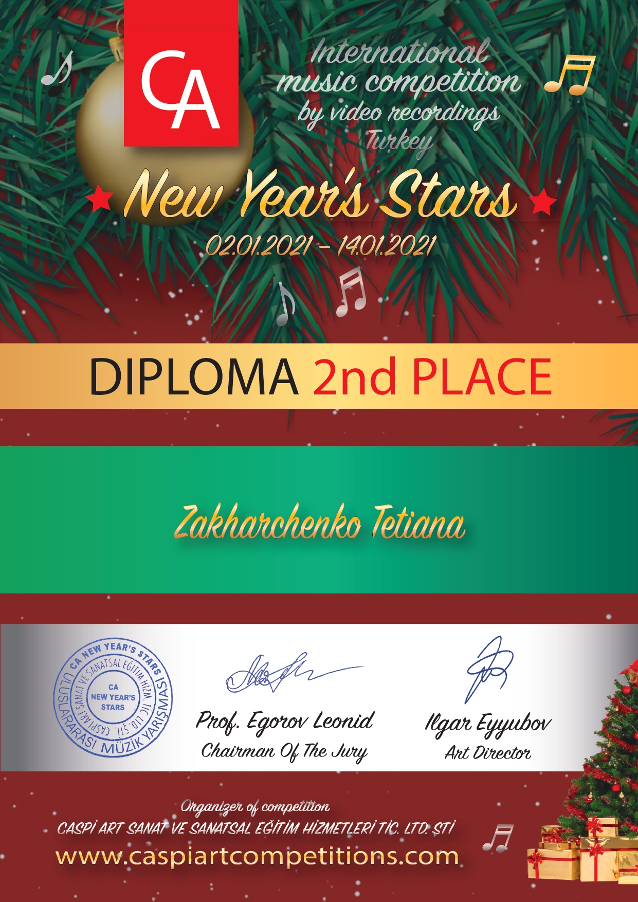 3 02.01.2021р. по 14.01.2021р. в Туреччині проходив Міжнародний конкурс мистецтв «CA NEW YEAR’S STARS» (за відеозаписами), організатор CASPİ ART SANAT VE SANATSAL EĞİTİM HİZMETLERİ TİC. LTD. ŞTİ., м.Мерсін.