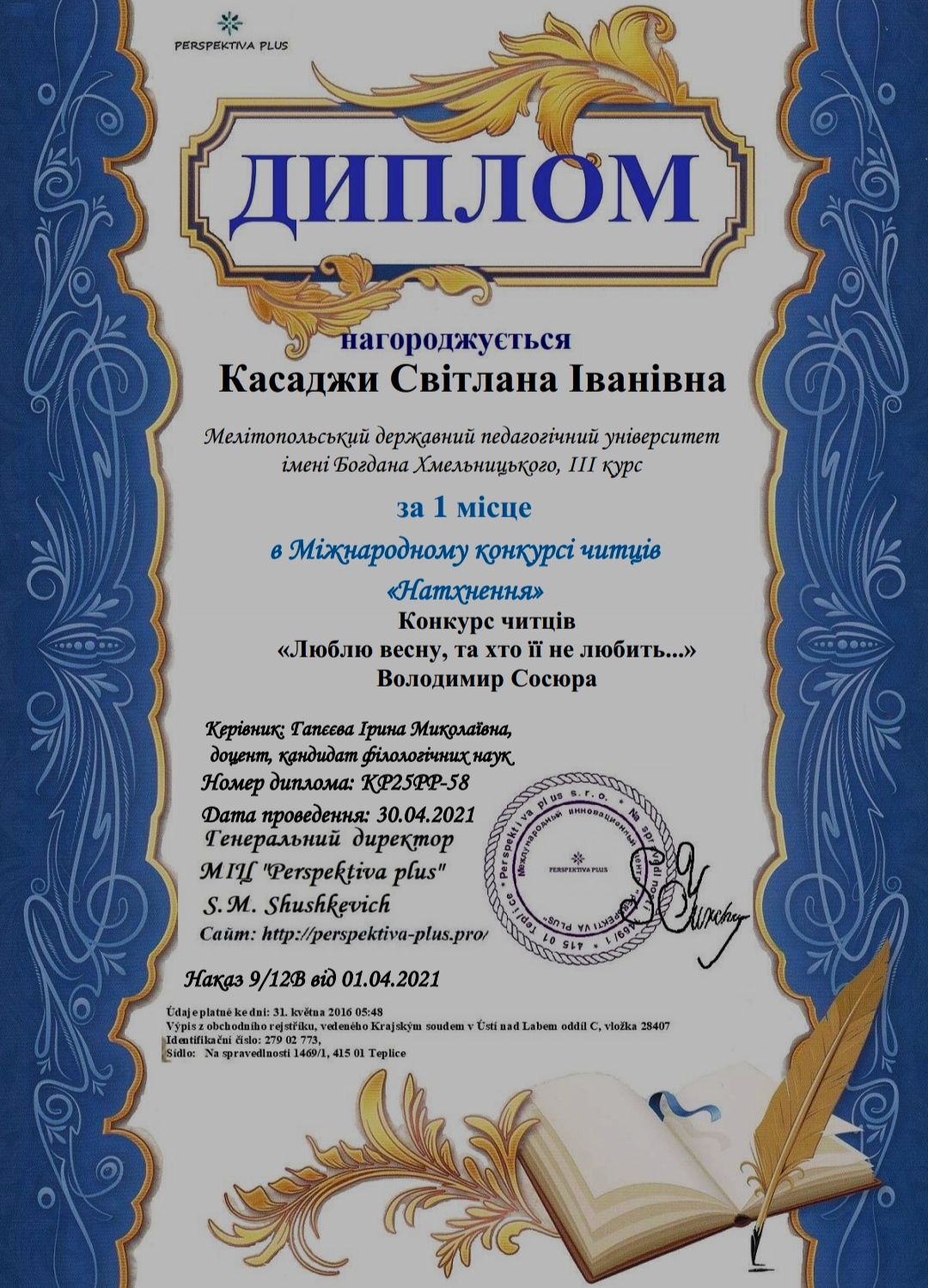 Наприкінці засідання відбулося нагородження студентів за активну участь у роботі гуртка та різноманітних мовних конкурсах. Так, студентка 318-ф групи КАСАДЖИ СВІТЛАНА посіла І місце у Міжнародному конкурсі читців «Натхнення» (Чехія, 01.04.2021), на якому представила поезію Володимира Сосюри «Люблю весну, та хто її не любить…».