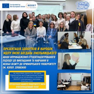 ⭐️💁🏻♀️30 листопада 2023 року викладачі університету доценти Павленко О.М., Сіроштан Т.В., Маслова А.В. презентували здобутки й наробки МДПУ імені Богдана Хмельницького щодо впровадження студентоцентрованого підходу до викладання та навчання в межах візиту до Приморського університету (м. Копер, Словенія)