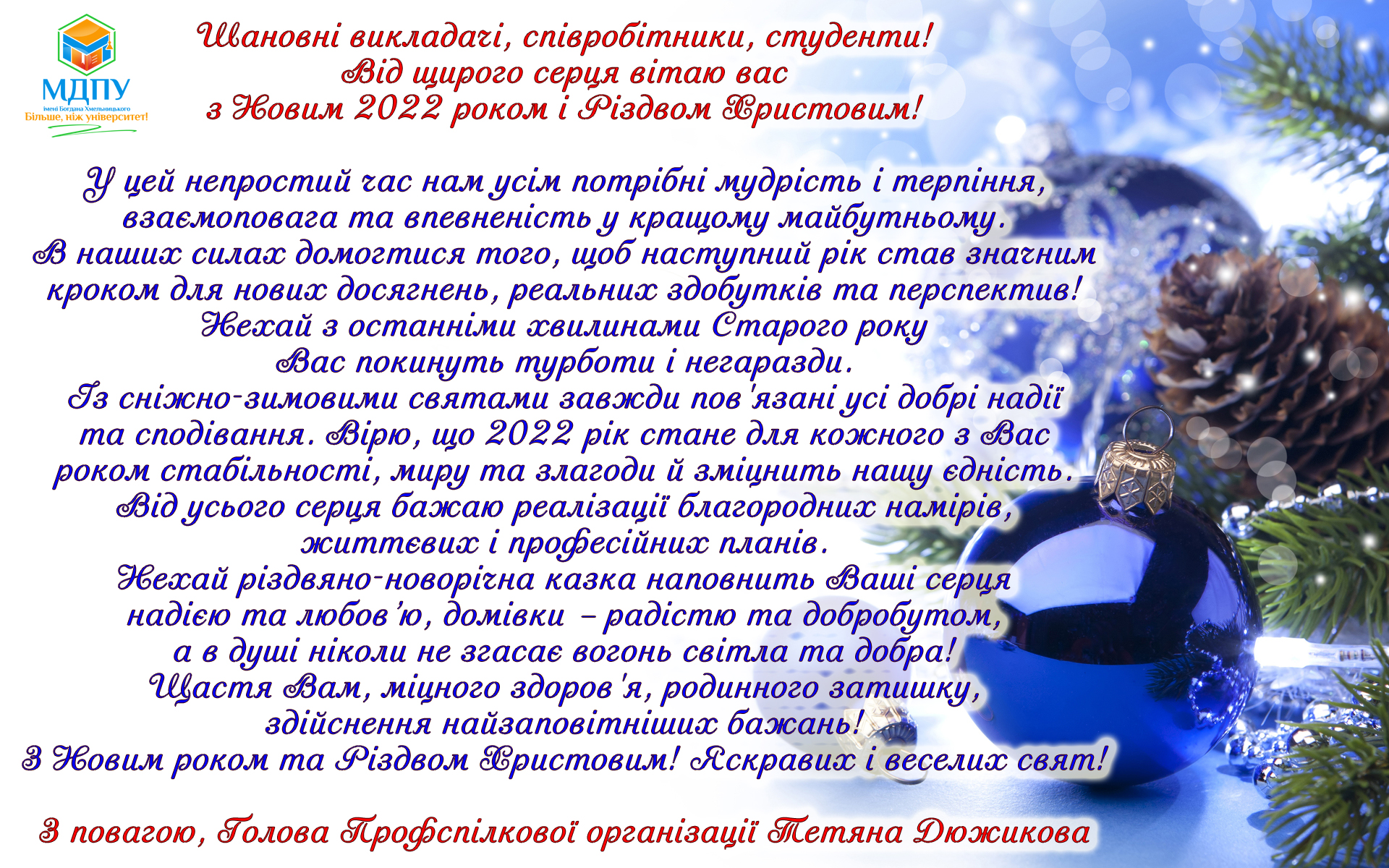 МДПУ > Новини університету > Привітання з Новим роком і Різдвом Христовим Голови Профспілкової організації Тетяни Дюжикової