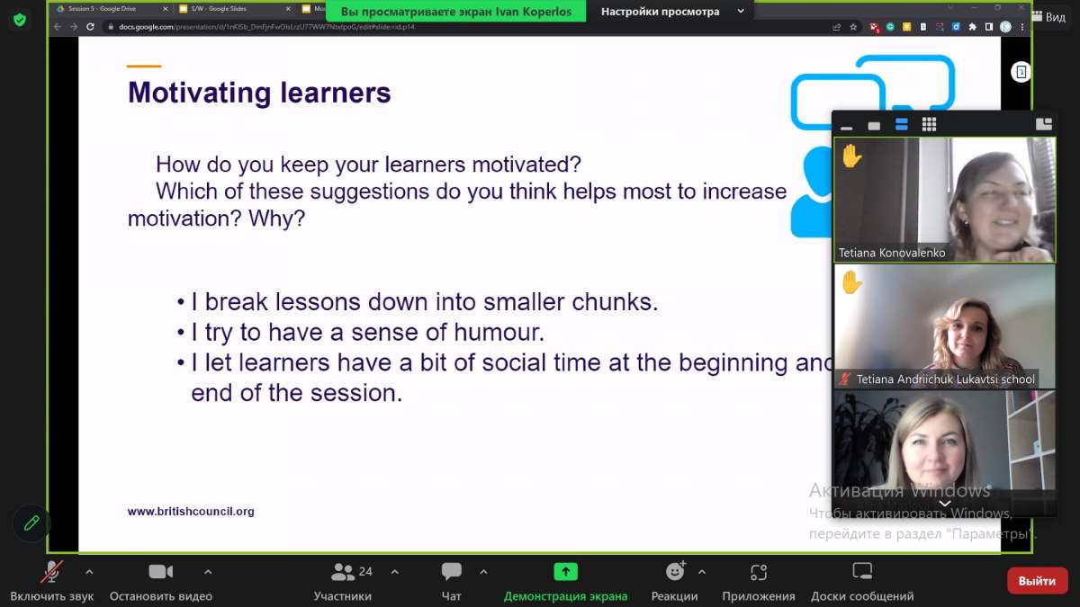 Викладачі кафедри методики викладання германських мов Коноваленко Т.В., Гончарова О.А., Маслова А.В. взяли участь у підвищенні кваліфікації за пілотним курсом «Teaching English in Basic School: grades 7 – 9» («Викладання англійської мови в основній школі: 7-9 класи») від Британської Ради в Україні.