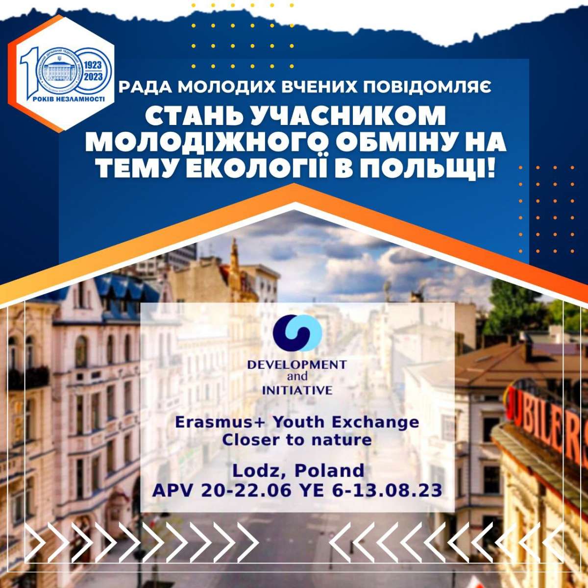 Рада молодих вчених МДПУ імені Богдана Хмельницького пропонує стати учасником та тім лідером на молодіжному обміні на тему екології в Польщі!