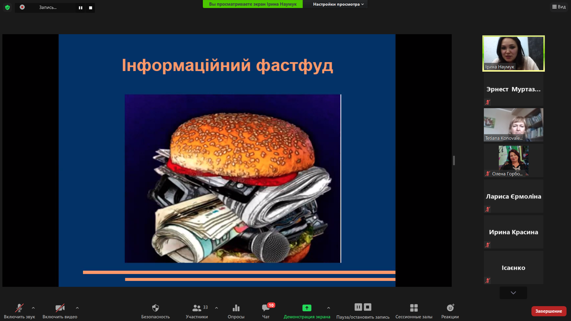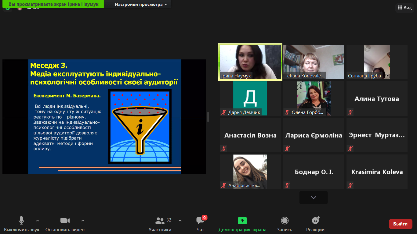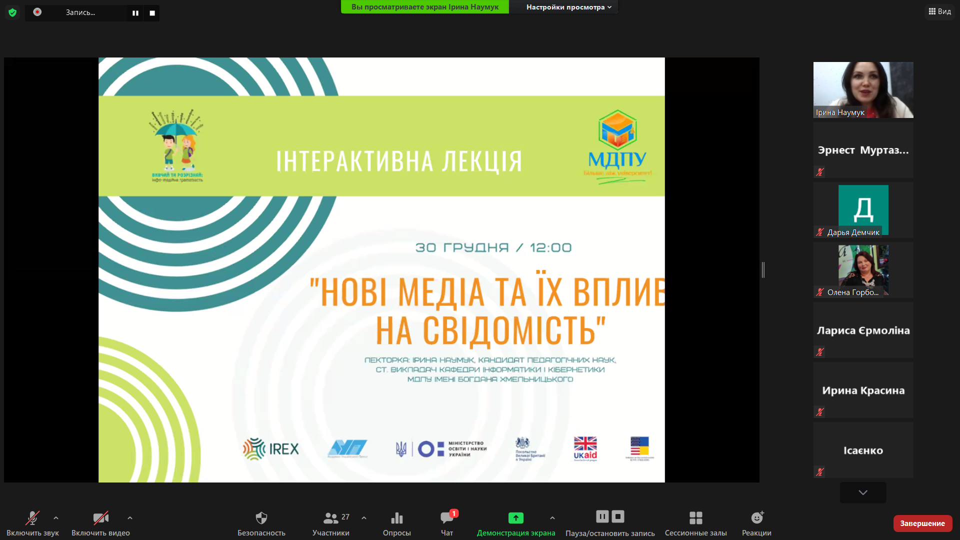 30 грудня 2020 р. старший викладач кафедри інформатики і кібернетики Ірина Наумук провела інтерактивну лекцію «Нові медіа та їх вплив на свідомість» для вчителів та молоді. Учасникам інтерактивної лекції будо запропоновано 10 основних компетентностей медіаграмотності, закони комунікації та особливості впливу медіа на свідомість. Розглянули формулу сприйняття інформації Альберта Меграбяна, відзначена актуальність впровадження медіаосвіти в Україні, впродовж лекції між учасниками виникла дискусія щодо інформованості та пропаганди їх видів та впливу на свідомість особистості, особливу цікавість викликала вправа «Моє медіасередовище». У другій частині заходу, було організовано створення творчих звітів у невеликих групах.