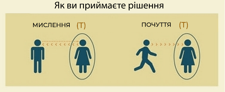 Прийняття рішень ґрунтується на відомій дихотомії «емоції і інтелект». Т-тип – це люди, для яких логіка стоїть на першому місці. Вони слідують голосу розуму і приймають рішення, лише ретельно все обміркувавши. Представники даного типу добре аналізують інформацію, а також справедливі й об’єктивні.
