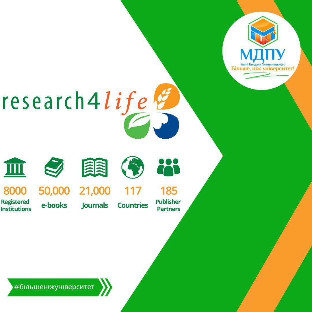 У межах платформи Research4Life забезпечується доступ до більше ніж 154 тис. наукових журналів і книг від більш як 200 видавців з усього світу. Платформа складається з 5 колекцій літератури: