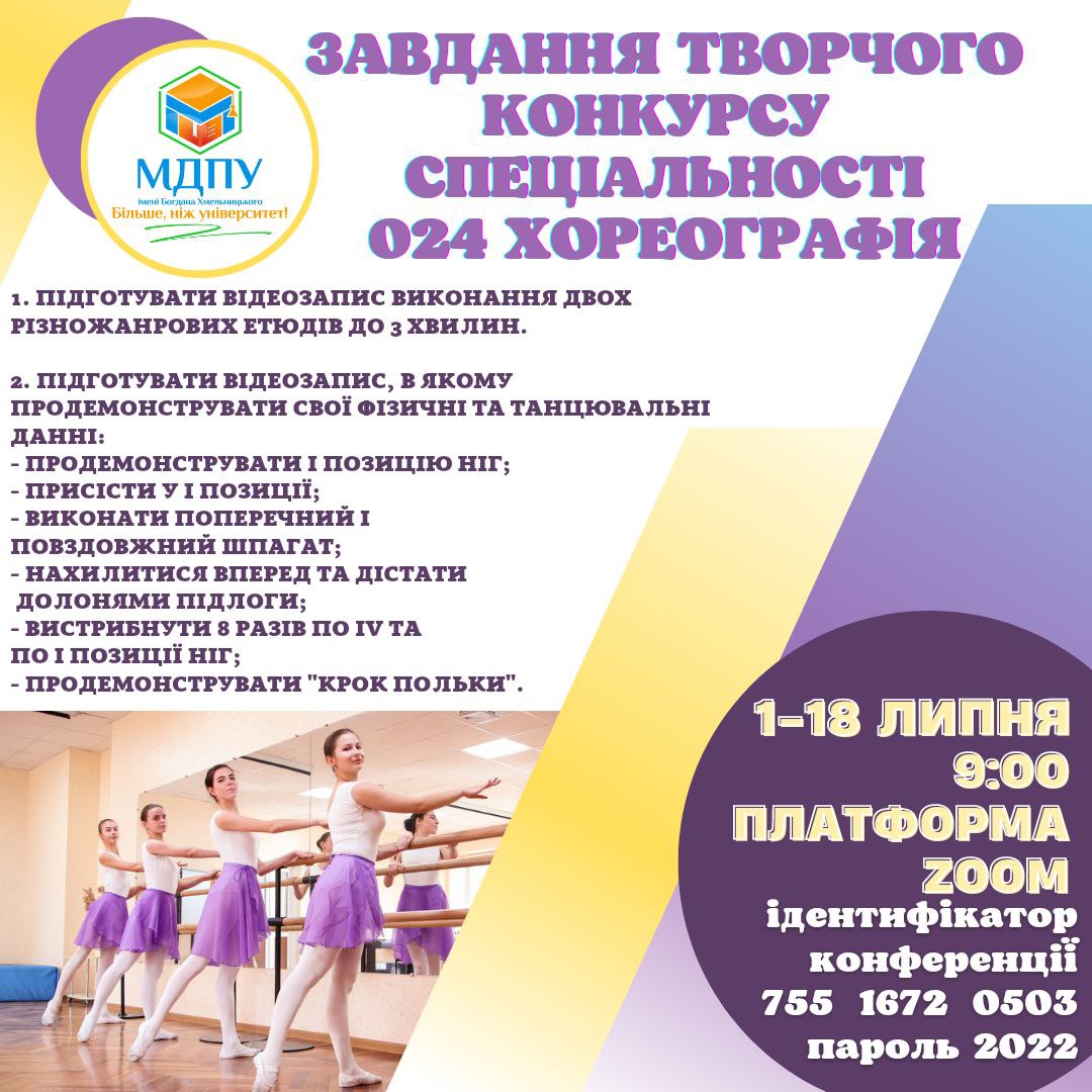 Нагадуємо, що з 1 липня розпочалися творчі конкурси на спеціальність 024 Хореографія МДПУ імені Богдана Хмельницького.