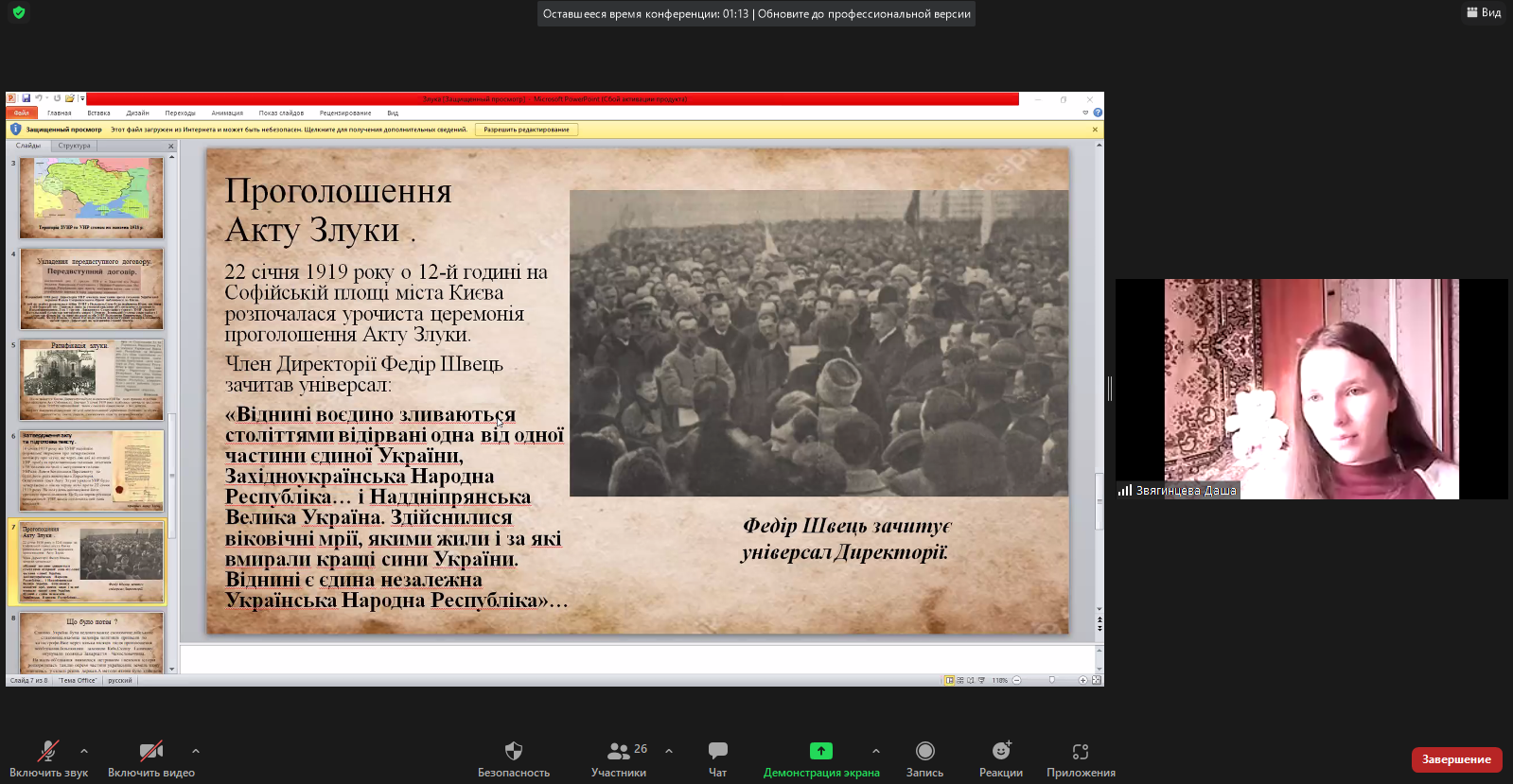 21 січня в рамках святкування 103 річниці Акту Злуки УНР та ЗУНР в Мелітопольському державному педагогічному університеті імені Богдана Хмельницького відбувся онлайн круглий стіл «День Соборності України».