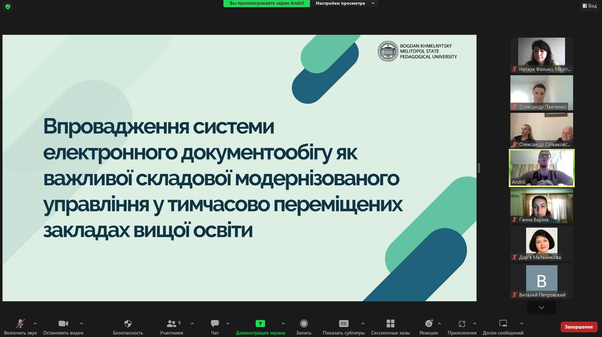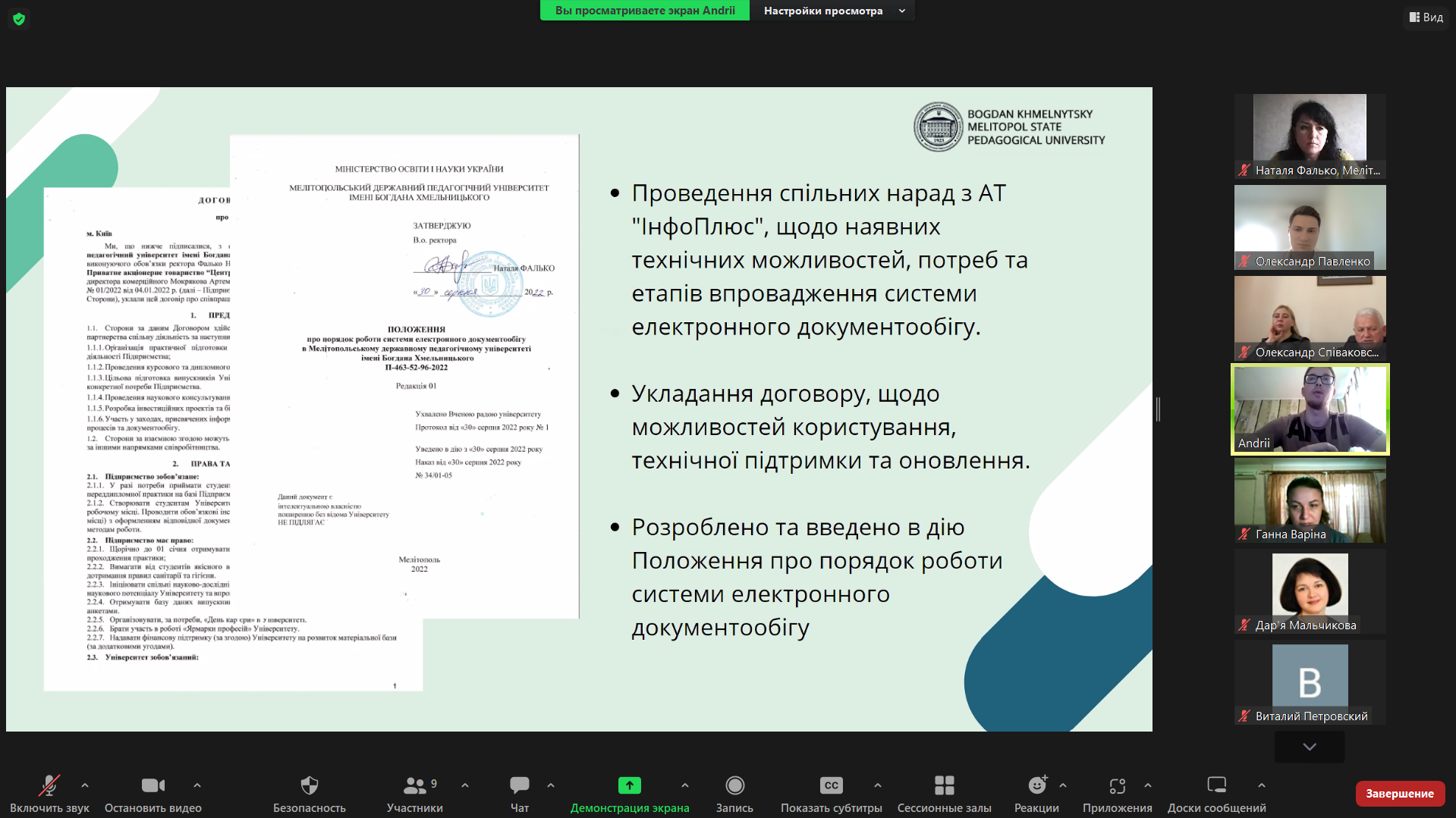 В.о. ректора Мелітопольського державного педагогічного університету імені Богдана Хмельницького Фалько Наталя Миколаївна наголосила на пріоритетності концептуально нового підходу інтеграції електронного документообігу у тимчасово переміщених закладах вищої освіти. Наталя Миколаївна акцентувала увагу на тому, що система електронного документообігу наразі забезпечує не тільки ефективне управління інституціями в умовах дистанційного функціонування та інформаційну безпеку організації, але й покращує контроль виконання функціональних завдань.