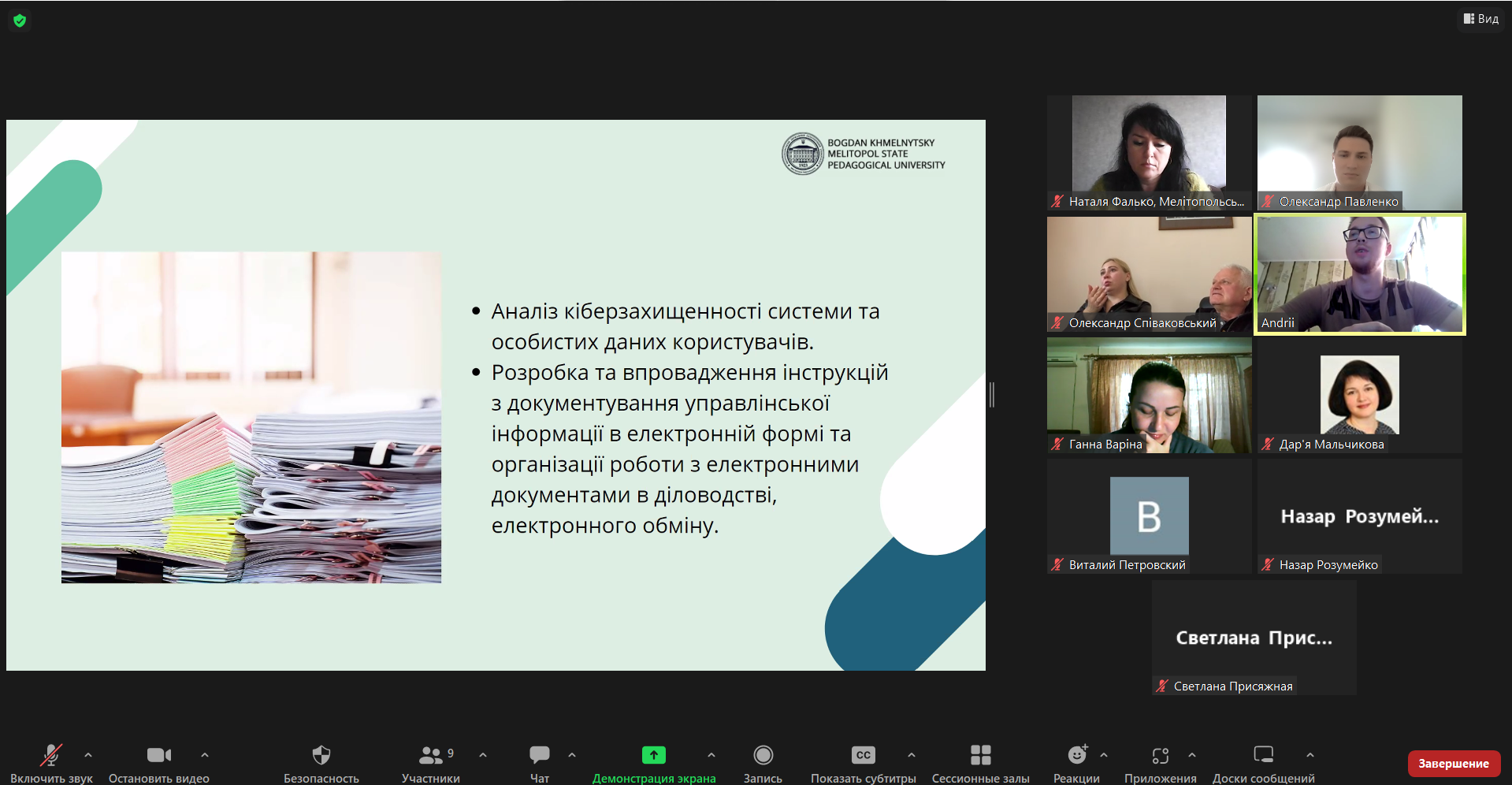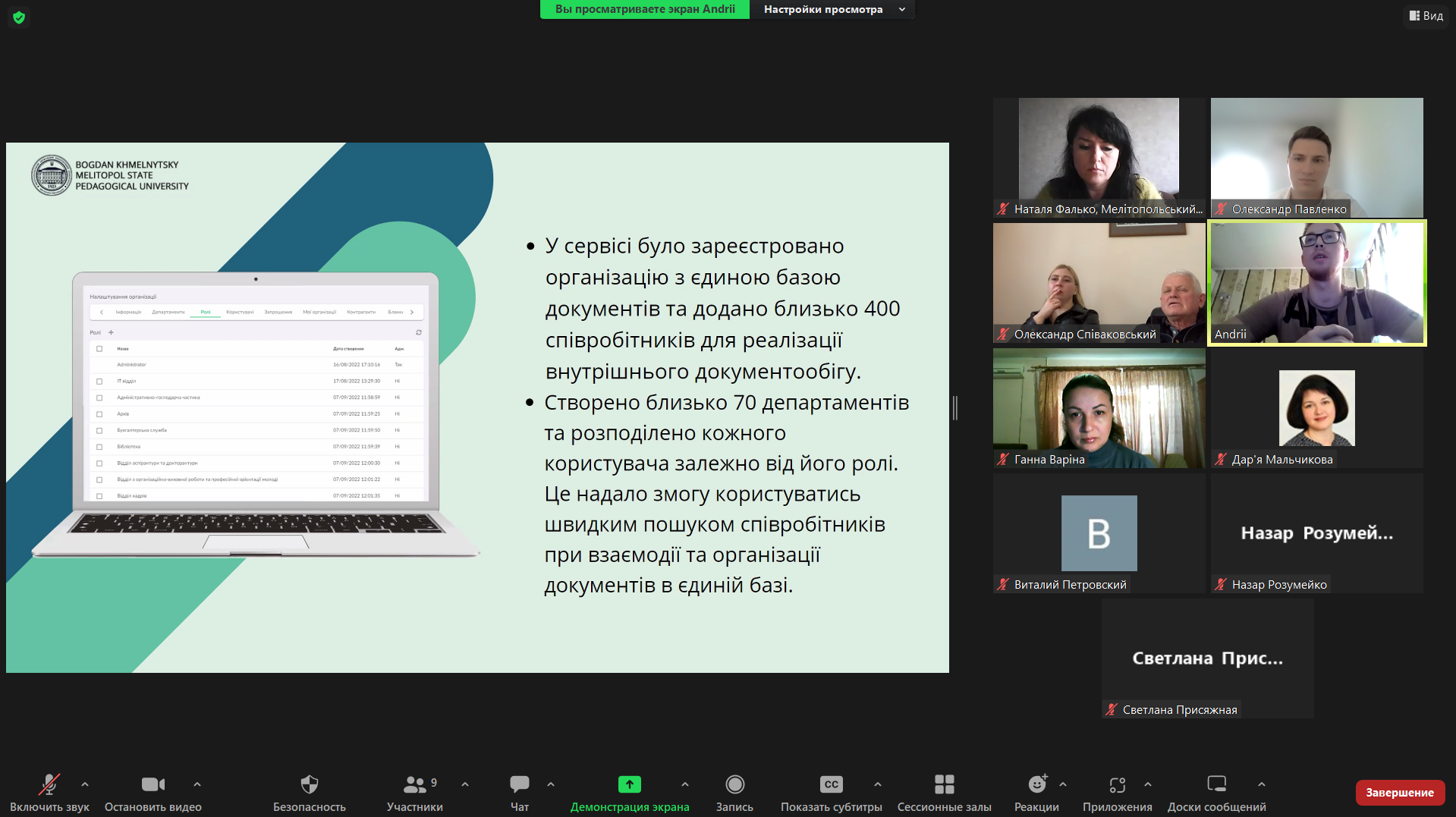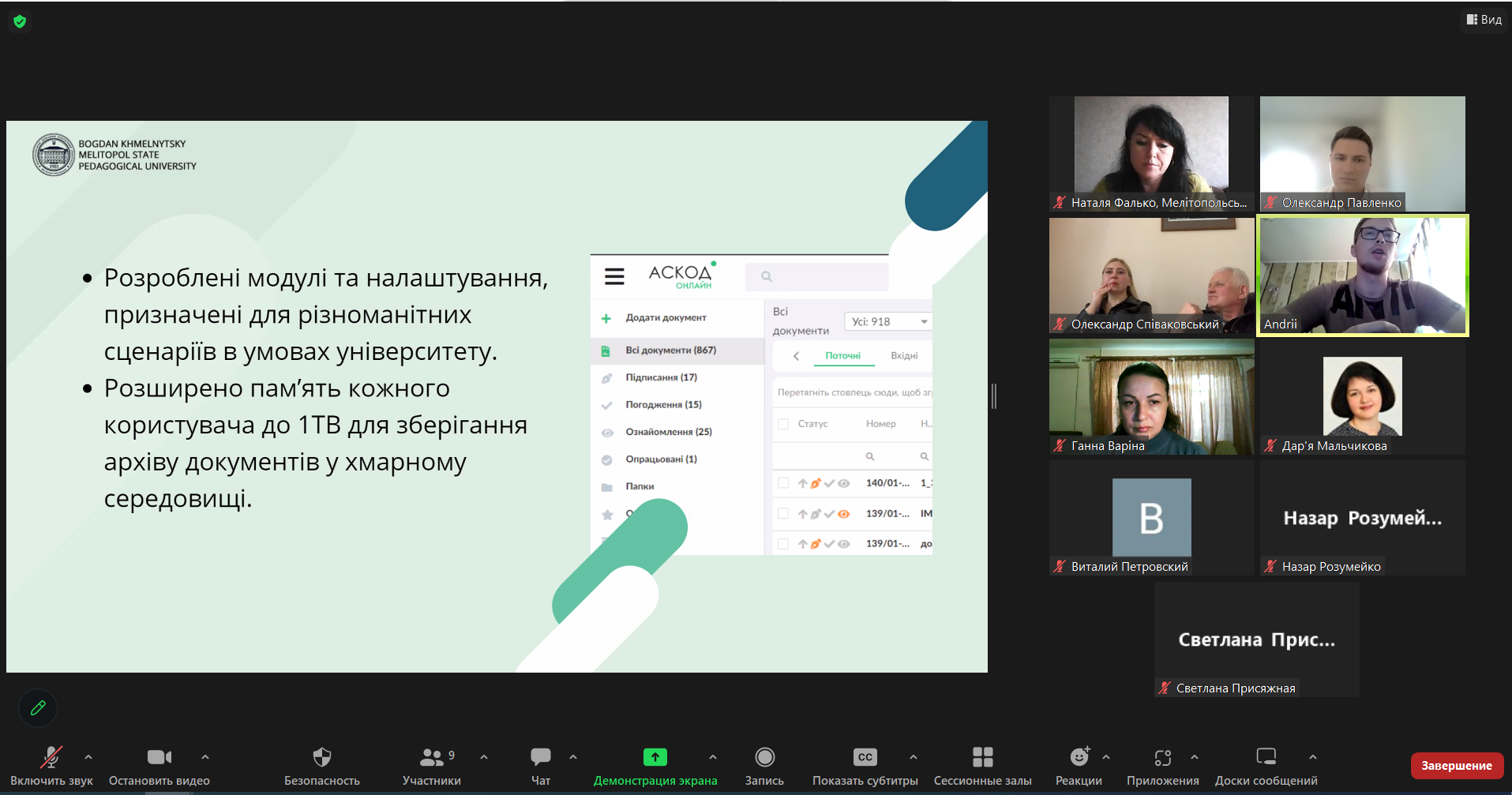 В процесі доповіді перший проректор МДПУ імені Богдана Хмельницького Павленко Олександр Михайлович разом з інженером Центру ІТ технологій та комп’ютерного дизайну Прядко Андрієм Олексійовичем презентували системну модель імплементації електронного документообігу на базі АСКОД в управлінський менеджмент Мелітопольського державного педагогічного університету імені Богдана Хмельницького. Олександр Михайлович наголосив на позитивних результатах інтеграції електронного документообігу в управлінську систему університету. Наразі 400 співробітників підключені до єдиної внутрішньої системи електронного документообігу.