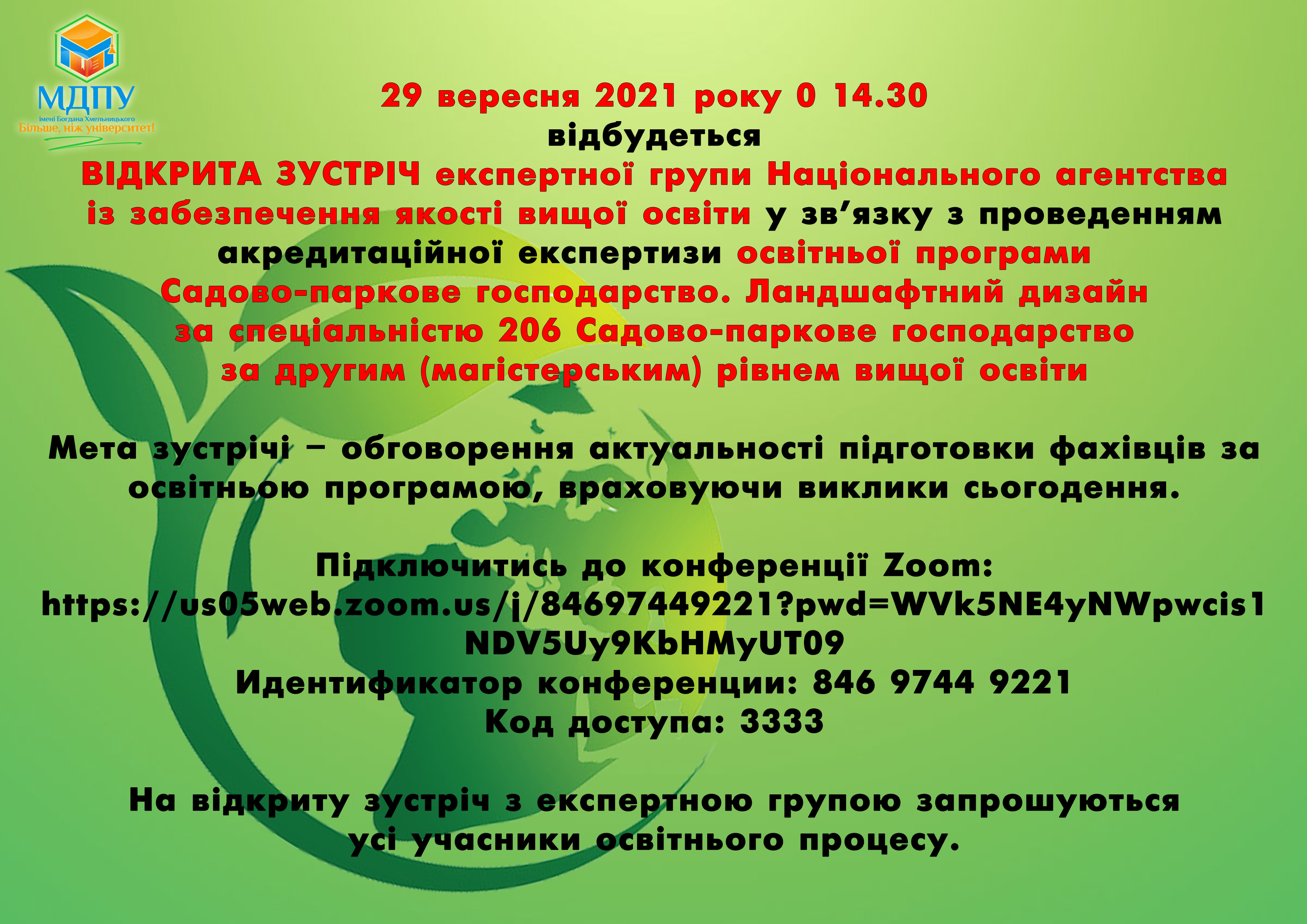 МДПУ > Новини університету > ВІДКРИТА ЗУСТРІЧ експертної групи НАЗЯВО у зв’язку з проведенням акредитаційної експертизи освітньої програми Садово-паркове господарство. Ландшафтний дизайн