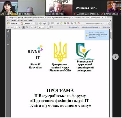 21-22 лютого 2023 року викладачі кафедри інформатики і кібернетики взяли участь у роботі ІІ Всеукраїнського форуму «Підготовка фахівців галузі ІТ-освіта в умовах воєнного стану», проведеного кафедрою інформаційно-комунікаційних технологій та методики викладання інформатики Рівненського державного гуманітарного університету спільно з ГС «Рівне ІТ-освіта» з метою обговорення особливостей підготовки фахівців галузі та формування їх професійних компетентностей.