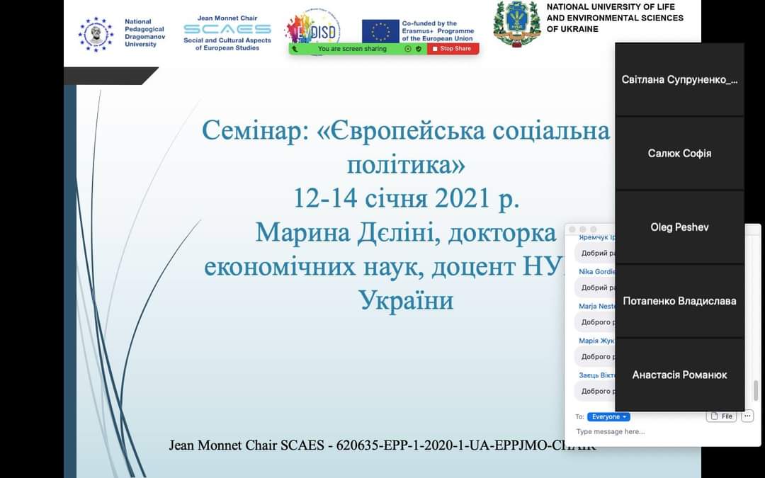 12-14 січня 2021р. відбувся семінар «Європейська соціальна політика», в якому взяли участь викладачі та аспіранти МДПУ імені Богдана Хмельницького (Гурова Т., Єрьоміна Л., Москальова Л., Пінігіна Ю., Георгадзе Т., Демьяненко А, Троїцька Т., Троїцька О., Землянський А., Александров Д, Пєшев О.)