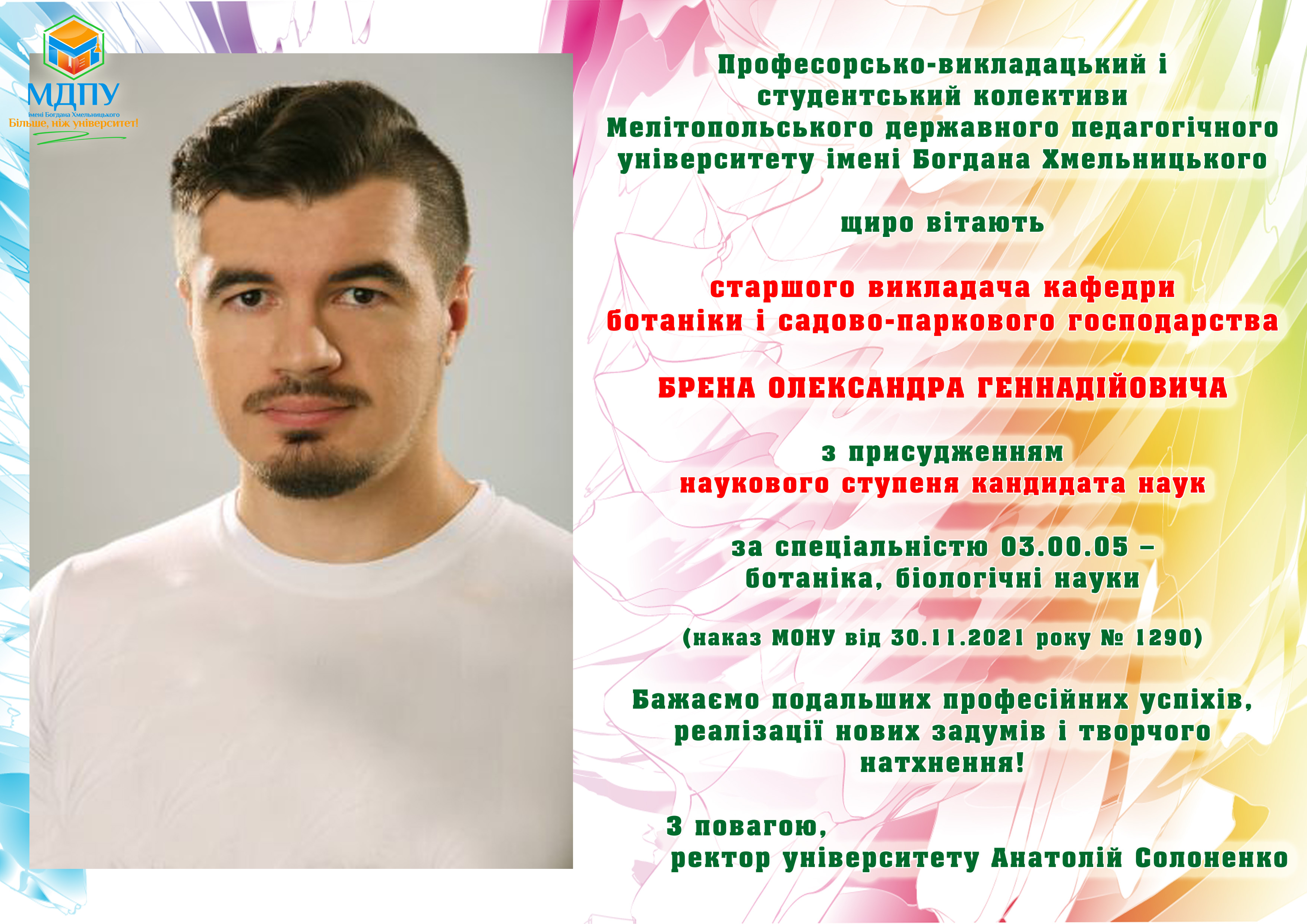 МДПУ > Новини університету > Вітаємо Олександра Брена з присудженням наукового ступеня кандидата наук!