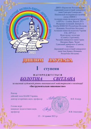 Диплом лауреата І ступеня – студентка Навчально-наукового інституту соціально-педагогічної та мистецької освіти Болотіна Світлана, керівник – доцент кафедри інструментального виконавства та музичного мистецтва естради Ірина Стотика.