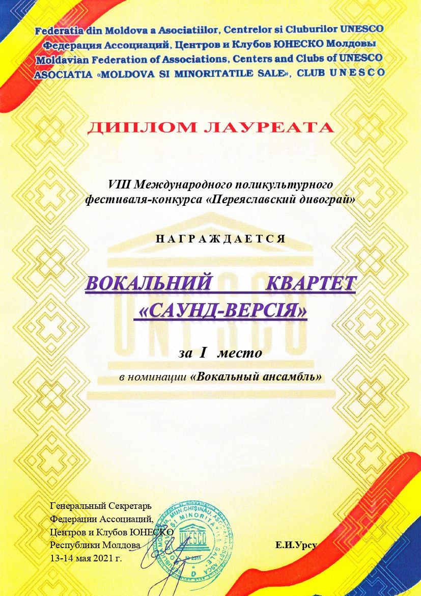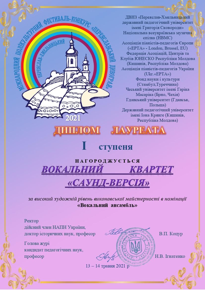 Диплом лауреата І ступеня – вокальний квартет «Саунд-версія», керівник – доцент кафедри інструментального виконавства та музичного мистецтва естради Олександр Стотика.