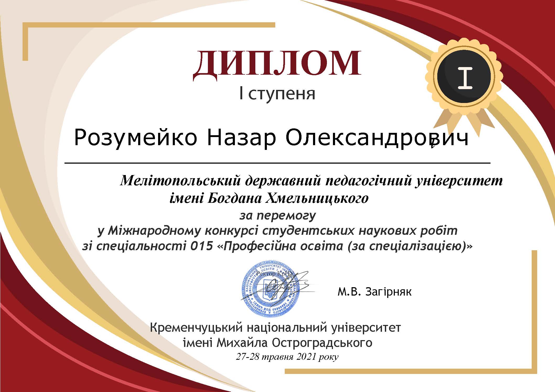 Здобувач ІІ курсу першого (бакалаврського) рівня спеціальності 015.10 Професійна освіта (Комп’ютерні технології) Розумейко Назар представив на захист наукову роботу на тему «Використання Class Time у підготовці педагогів професійного навчання» і нагороджений дипломом І ступеня!