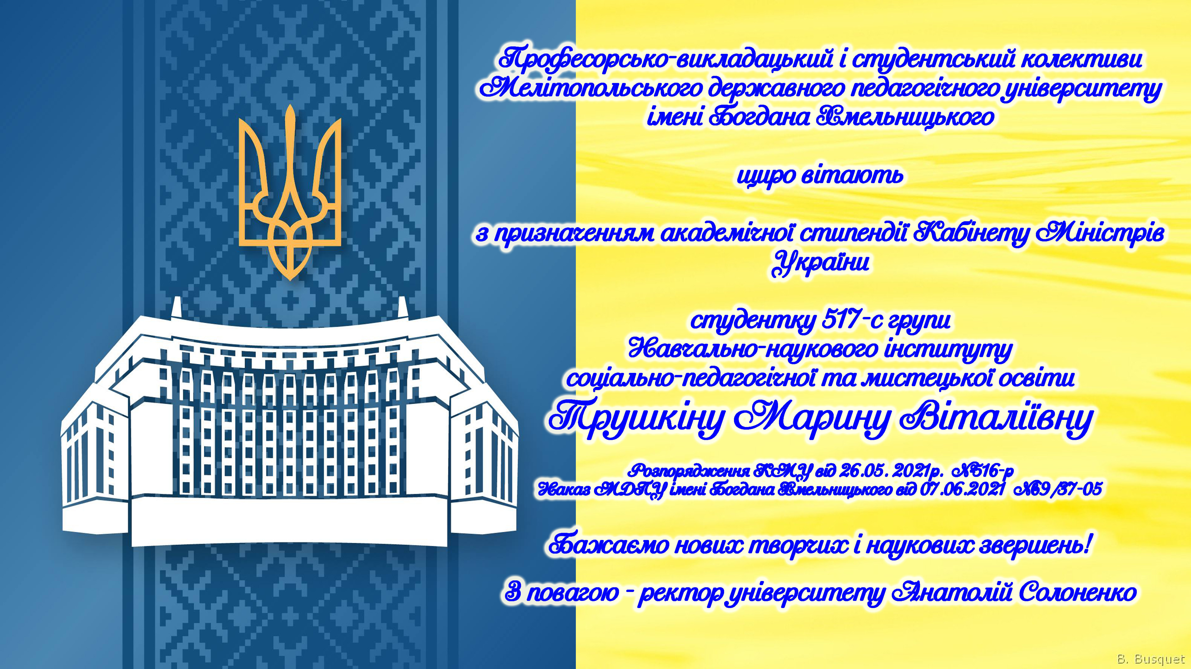 МДПУ > Новини університету > Вітаємо студентку Навчально-наукового інституту соціально-педагогічної та мистецької освіти Марину Трушкіну з призначенням академічної стипендії Кабінету Міністрів України!