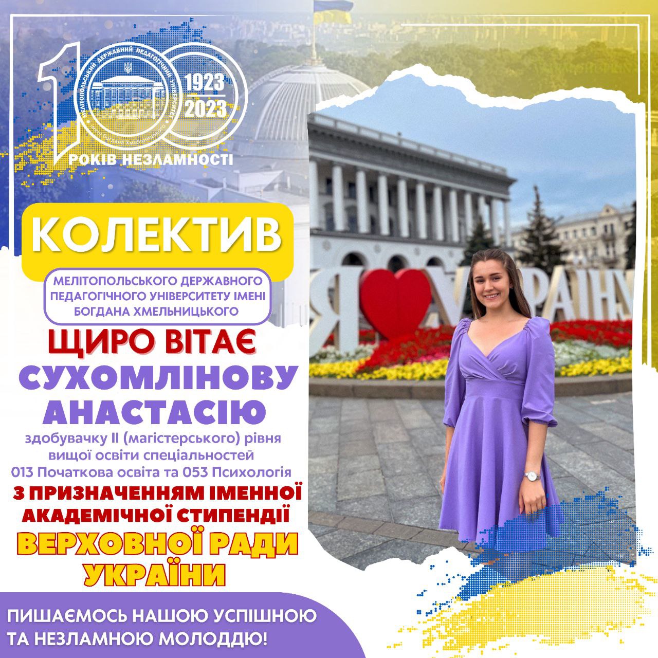 Колектив Мелітопольського державного педагогічного університету імені Богдана Хмельницького щиро вітає здобувачку ІІ (магістерського) рівня вищої освіти спеціальностей 013 Початкова освіта та 053 Психологія, голову студентської ради університету СУХОМЛІНОВУ АНАСТАСІЮ з призначенням іменної академічної стипендії Верховної Ради України!