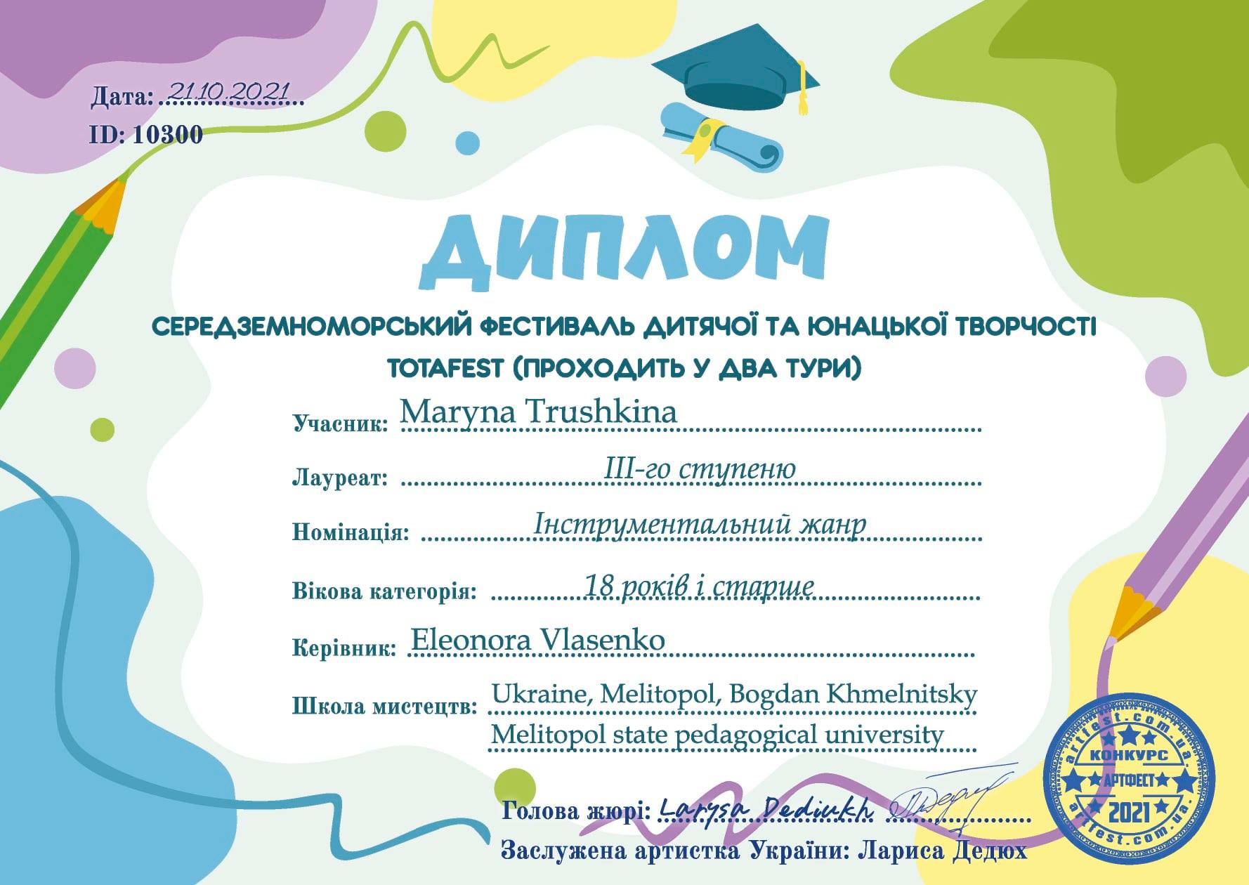 Кафедра інструментального виконавства та музичного мистецтва естради продовжує презентувати виступи студентів на міжнародних творчих фахових конкурсах.Міжнародний Середземноморський конкурс-фестиваль дитячої та юнацької творчості «Тотафест 2021» (Україна-Болгарія) запросив юних виконавців вперше у жовтні 2021 року.