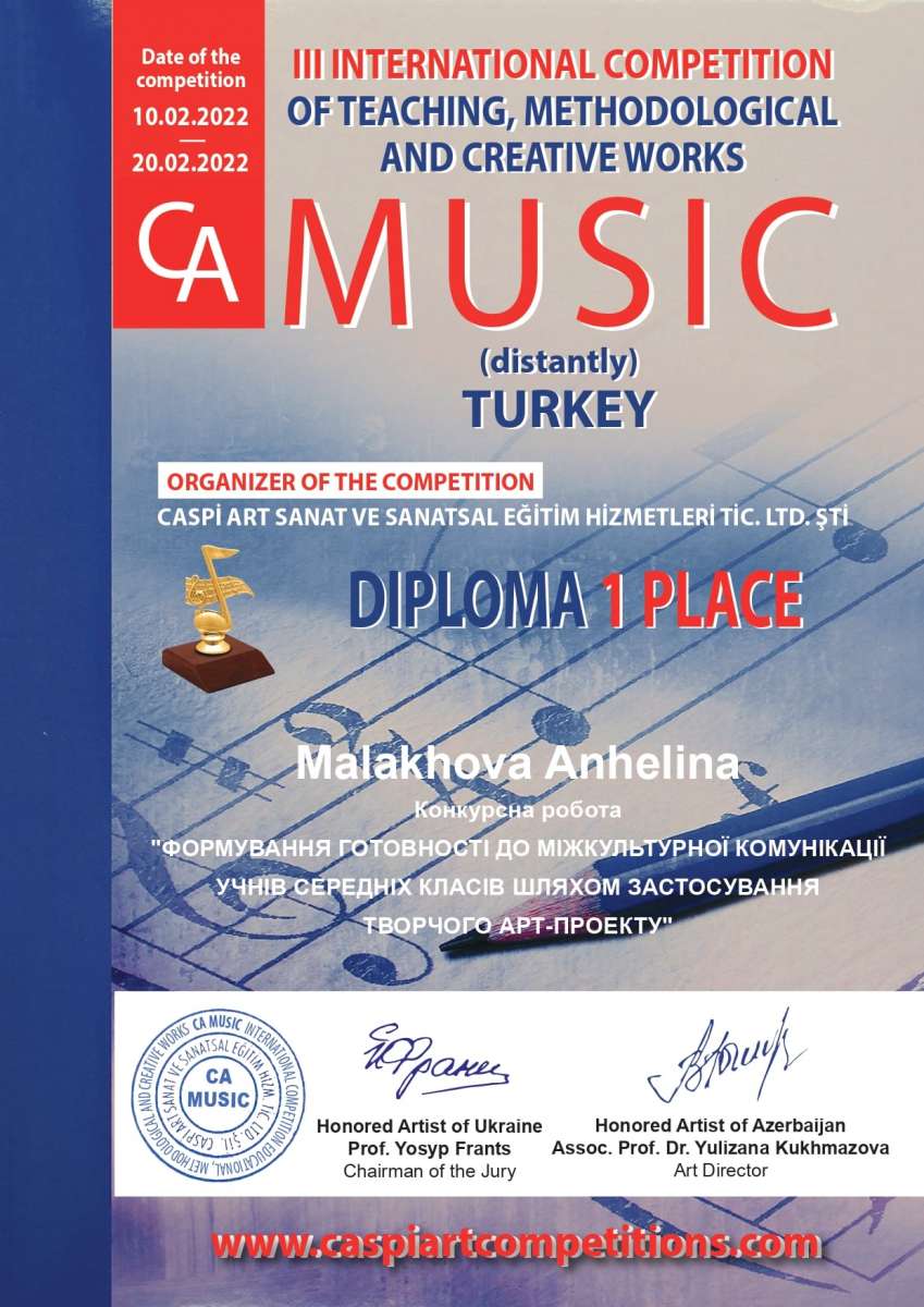 Колектив Мелітопольського державного педагогічного університету імені Богдана Хмельницького щиро вітає студентку четвертого курсу Навчально-наукового інституту соціально-педагогічної та мистецької освіти Ангеліну Малахову та її наукового керівника – старшого викладача кафедри інструментального виконавства та музичного мистецтва естради Елеонору Власенко з перемогою у ІІІ Міжнародному конкурсі наукових, методичних та творчих робіт CA Music – Диплом за 1 місце.