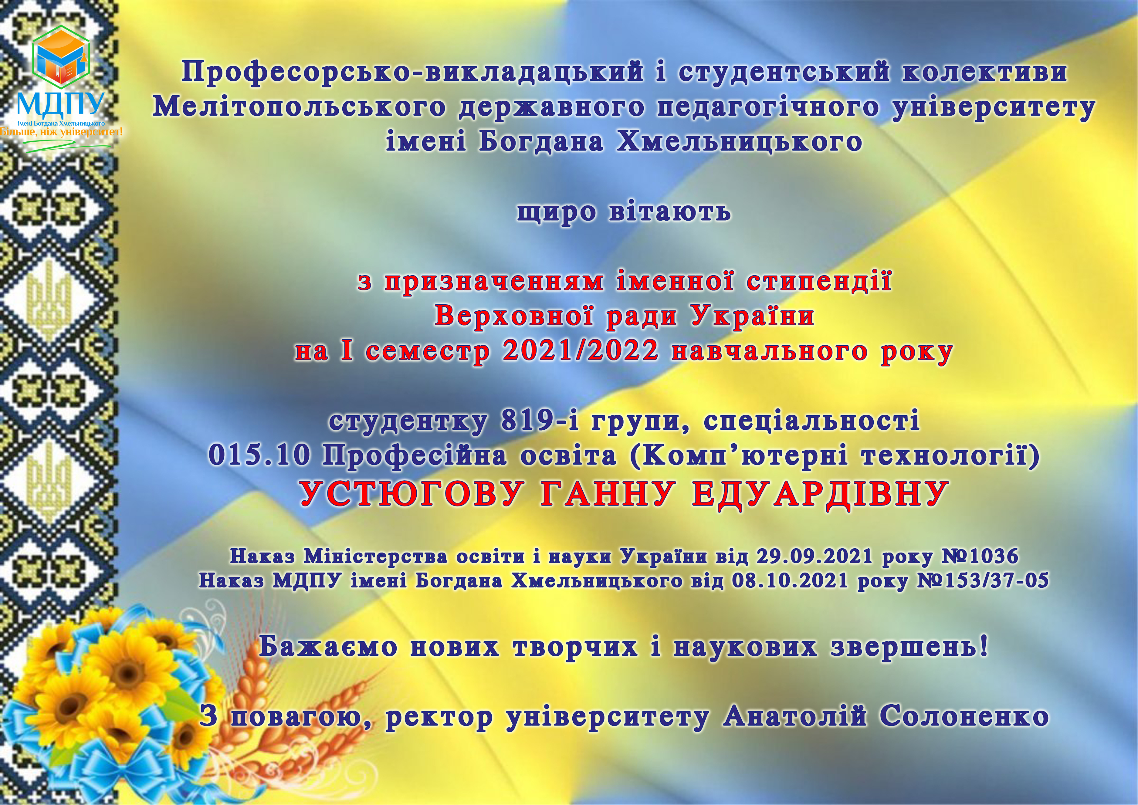 МДПУ > Новини університету > Вітаємо з призначенням іменної стипендії Верховної ради України!