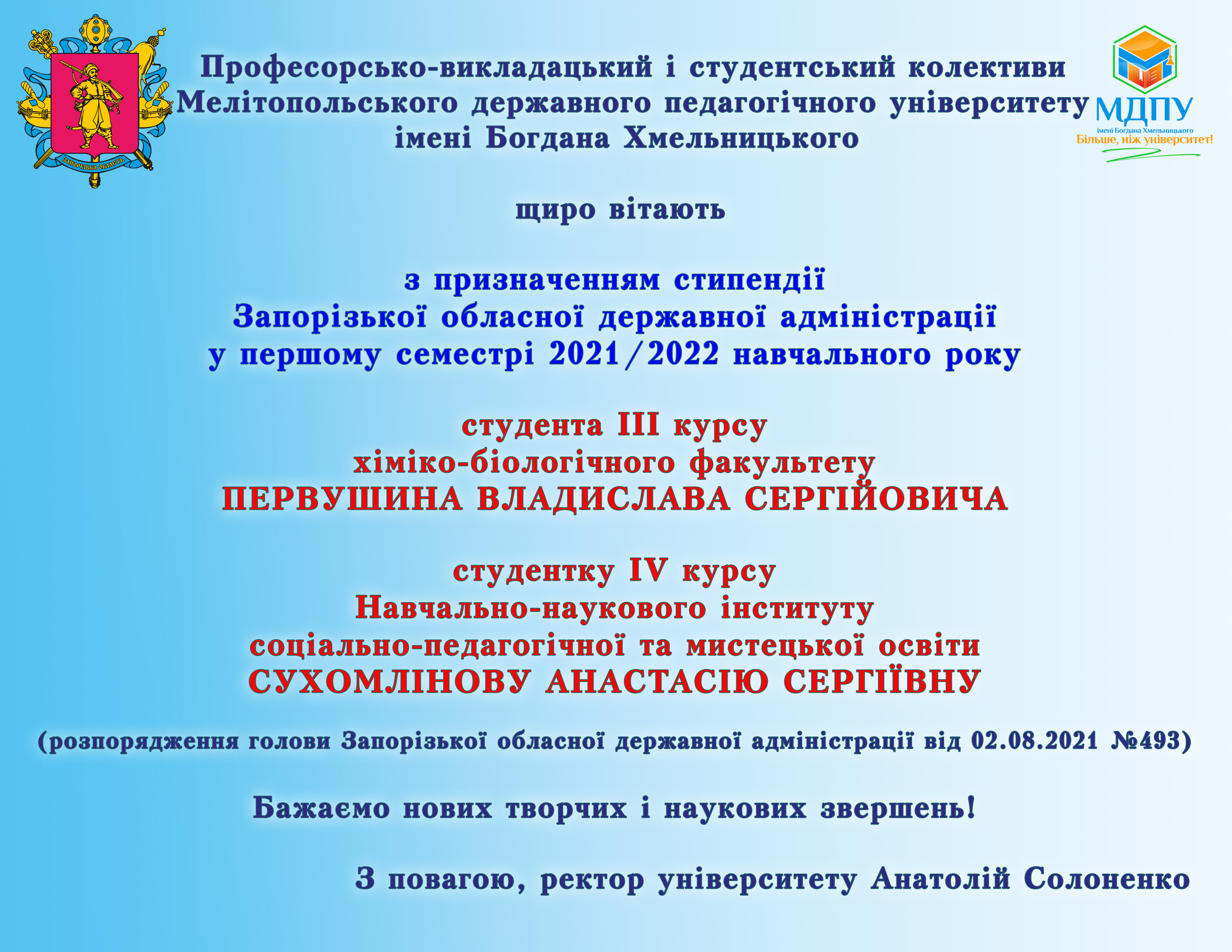 МДПУ > Новини університету > Вітаємо з призначенням стипендії Запорізької обласної державної адміністрації у першому семестрі 2021/2022 навчального року!
