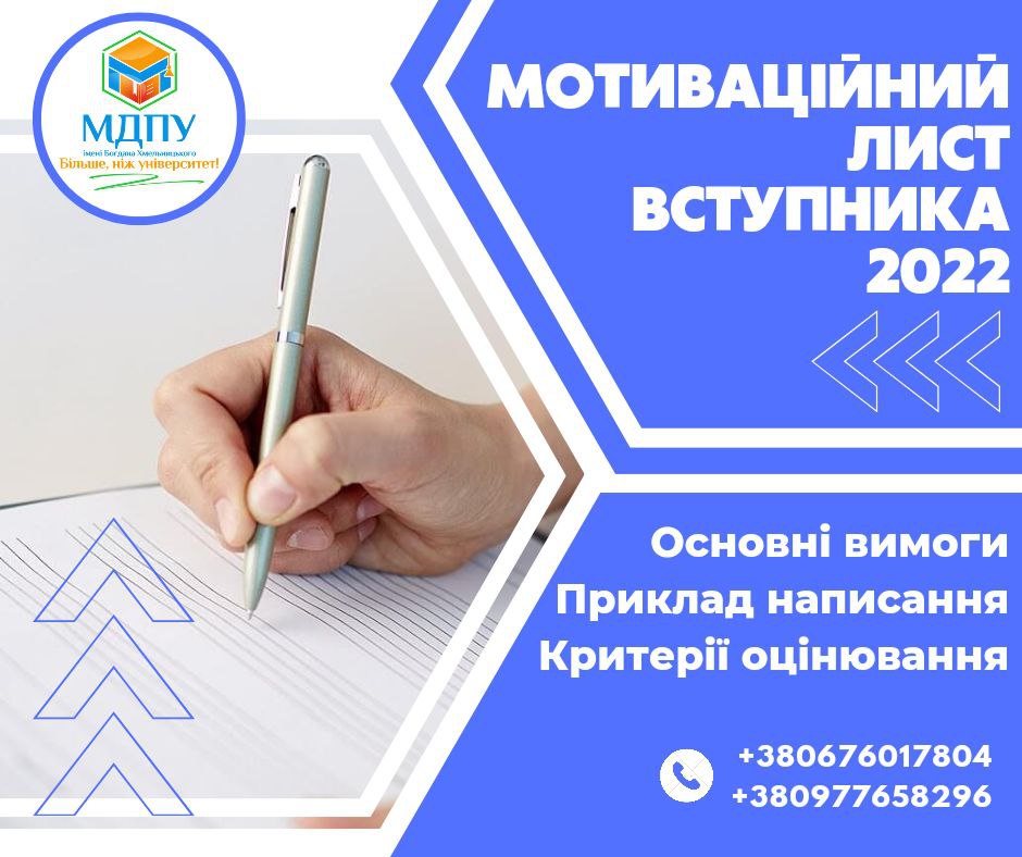 Увага! Методичні рекомендації до написання мотиваційного листа розміщенні на сайті Вступника vstup.mdpu.org.ua та за посиланням https://drive.google.com/file/d/1-sTQ4rVg09BxMwOW-amq4QBQ6B6QaTDx/view