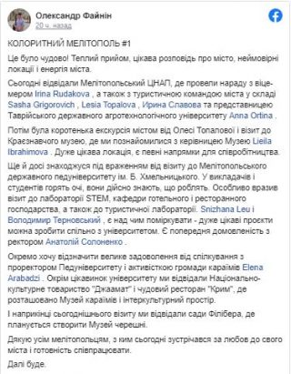 Наприкінці візиту відбулася зустріч з представниками Наукового парку «Melitopol travel university». Декан природничо-географічного факультету Лариса Донченко і доцент кафедри туризму, соціально-економічної географії та краєзнавства, консультант з питань розвитку туризму КУ «Агенція розвитку Мелітополя» Олеся Топалова презентували наробки в галузі туризму, серед яких: