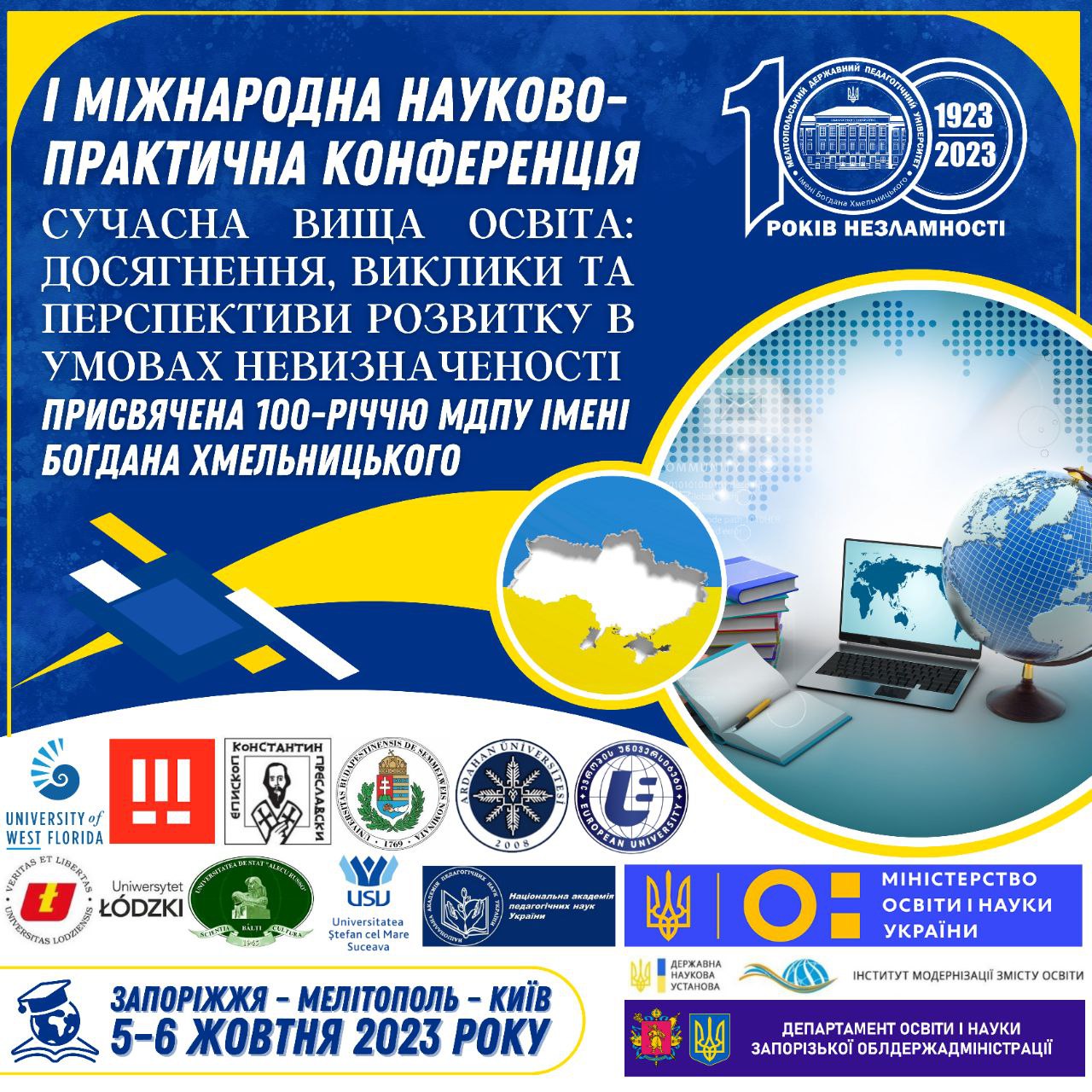 Запрошуємо взяти участь у І МІЖНАРОДНІЙ НАУКОВО-ПРАКТИЧНІЙ КОНФЕРЕНЦІЇ «СУЧАСНА ВИЩА ОСВІТА: ДОСЯГНЕННЯ, ВИКЛИКИ ТА ПЕРСПЕКТИВИ РОЗВИТКУ В УМОВАХ НЕВИЗНАЧЕНОСТІ», присвяченій 100-річчю МДПУ імені Богдана Хмельницького!